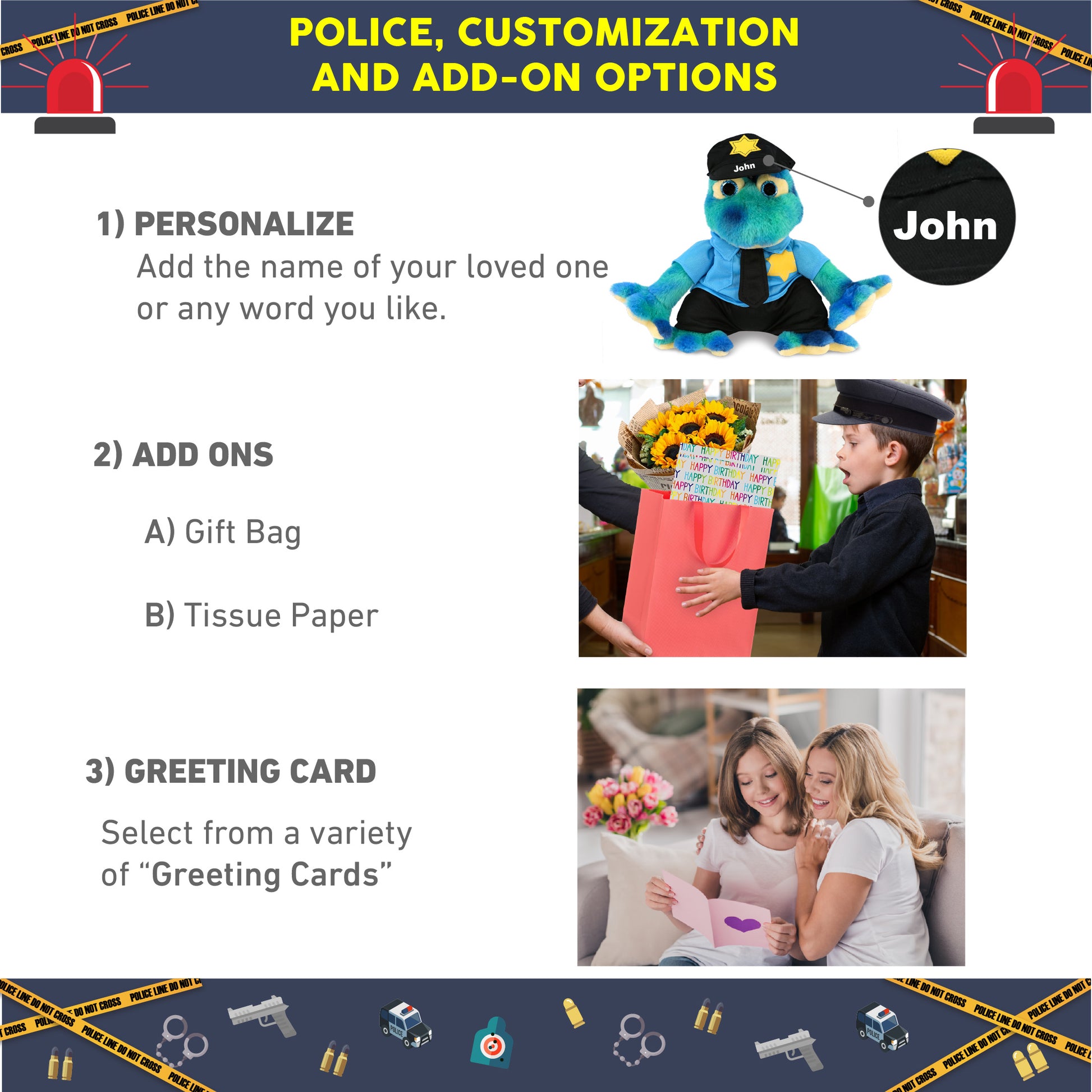 Personalization, Customization, and Add-On Options - Super Soft Blue Tie-Dye Frog Police Officer Plush comes customized with a cop uniform and cap. You can personalize it with the name of your loved one imprinted on the item. You also have the option to add some or all of the cool add-ons to make your gift extra special: 1) Gift Bag; 2) Tissue Paper; 3) Greeting Card.