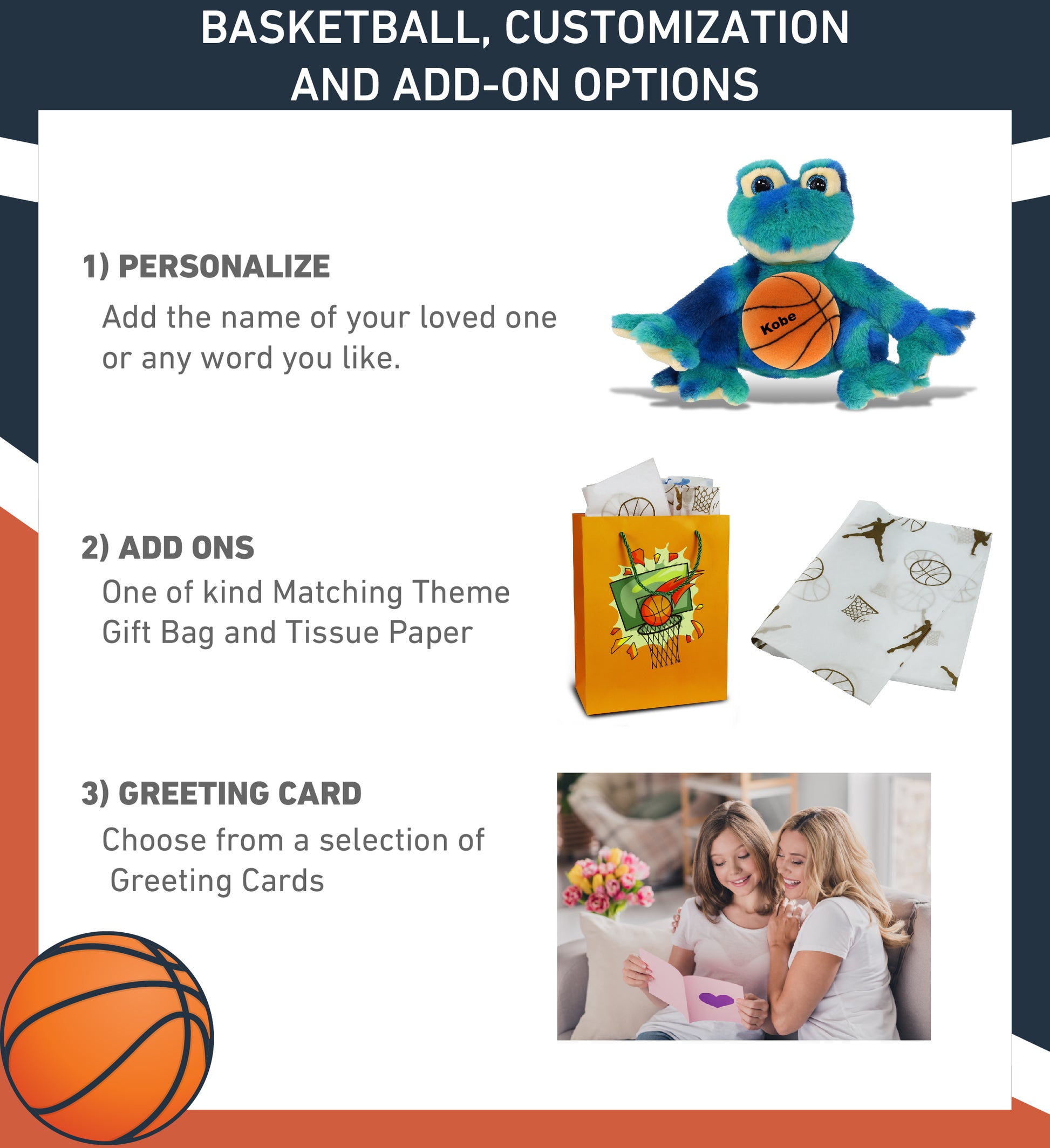 Personalization, Customization, and Add-on Options - The Super Soft Sports Stuffed Animal Blue Tie-Dye Frog comes customized with a basketball plush. You can personalize your frog plush toy with the name of your loved one, which we will imprint on the item. You also have the option to add some or all of the cool add-ons to make your plush gift extra special: 1) Gift Bag; 2) Tissue Paper; 3) Greeting Card.