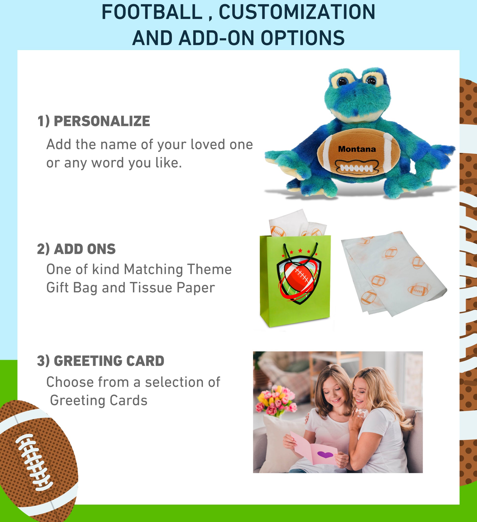 Personalization, Customization, and Add-On Options - This Super Soft Sports Stuffed Animal Blue Tie-Dye Frog Plush comes customized with a football plush. You can personalize it with the name of your loved one imprinted on the item. You also have the option to add some or all of the cool add-ons to make your gift extra special: 1) Gift Bag; 2) Tissue Paper; 3) Greeting Card.