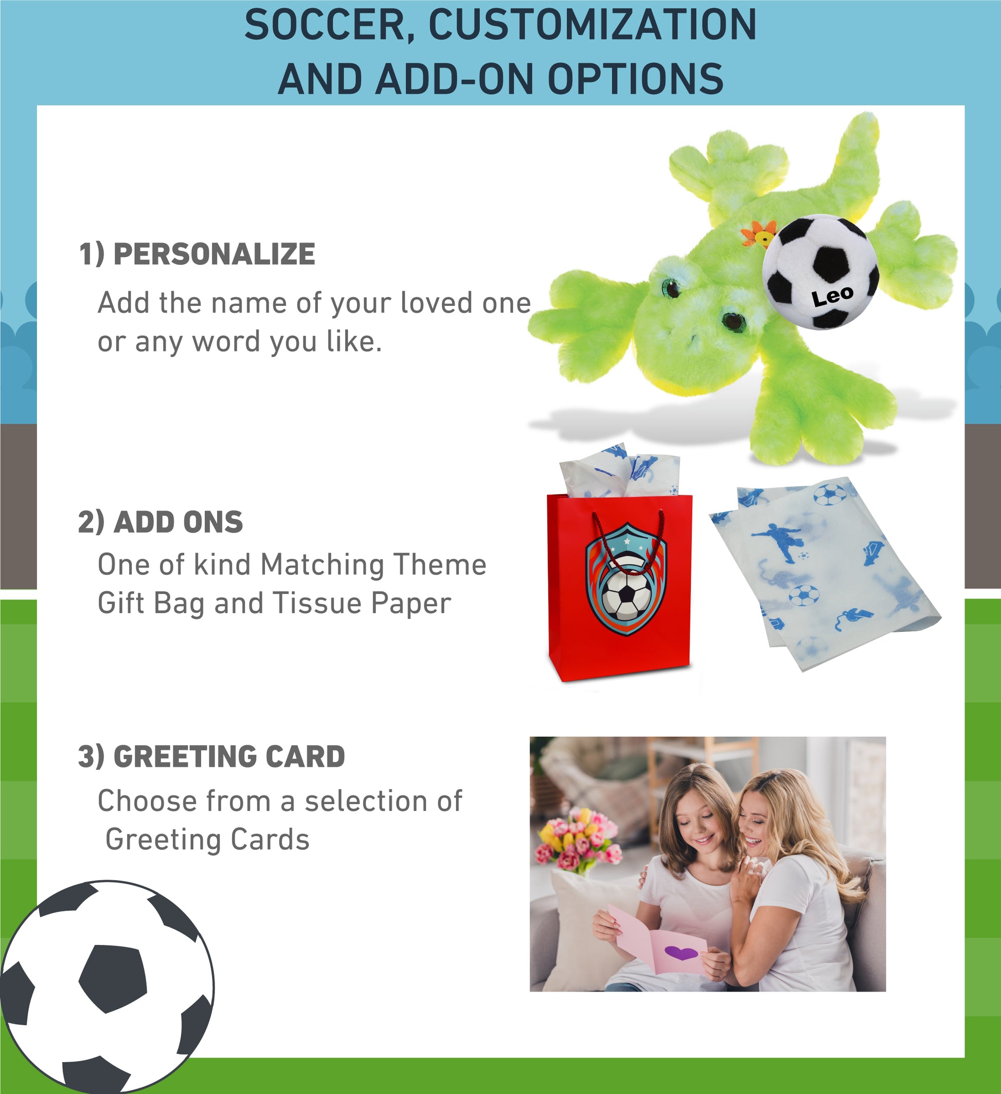 PERSONALIZATION, CUSTOMIZATION, AND ADD-ON OPTIONS - Super Soft Sports Stuffed Animal Gecko comes customized with a Soccer Ball Plush. You can personalize it with the name of your loved one imprinted on the item. You also have the option to add some or all of the cool add-ons to make your gift extra special: 1) Gift Bag; 2) Tissue Paper; 3) Greeting Card.