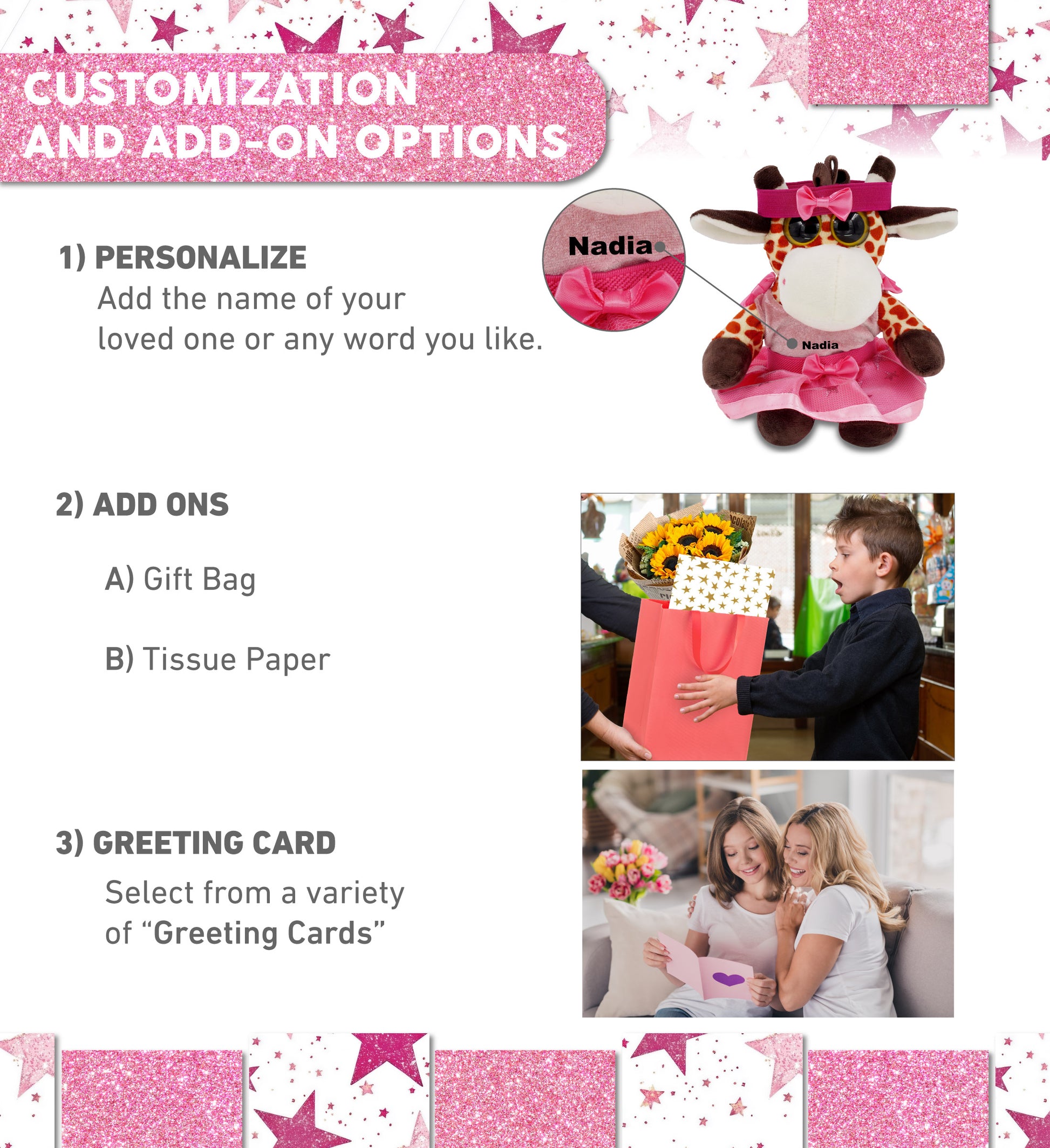 Personalization, Customization, and Add-On Options - The giraffe plush toy comes dressed in a charming pink ballerina outfit, complete with tutu skirt, headband, and shirt. Make it meaningful by personalizing it with the name, which we will imprint directly onto the plush. You can also customize your ballerina giraffe stuffed animal doll by adding any of our add-ons to create the perfect gift: 1) Gift Bag 2) Tissue Paper 3) Greeting Card.