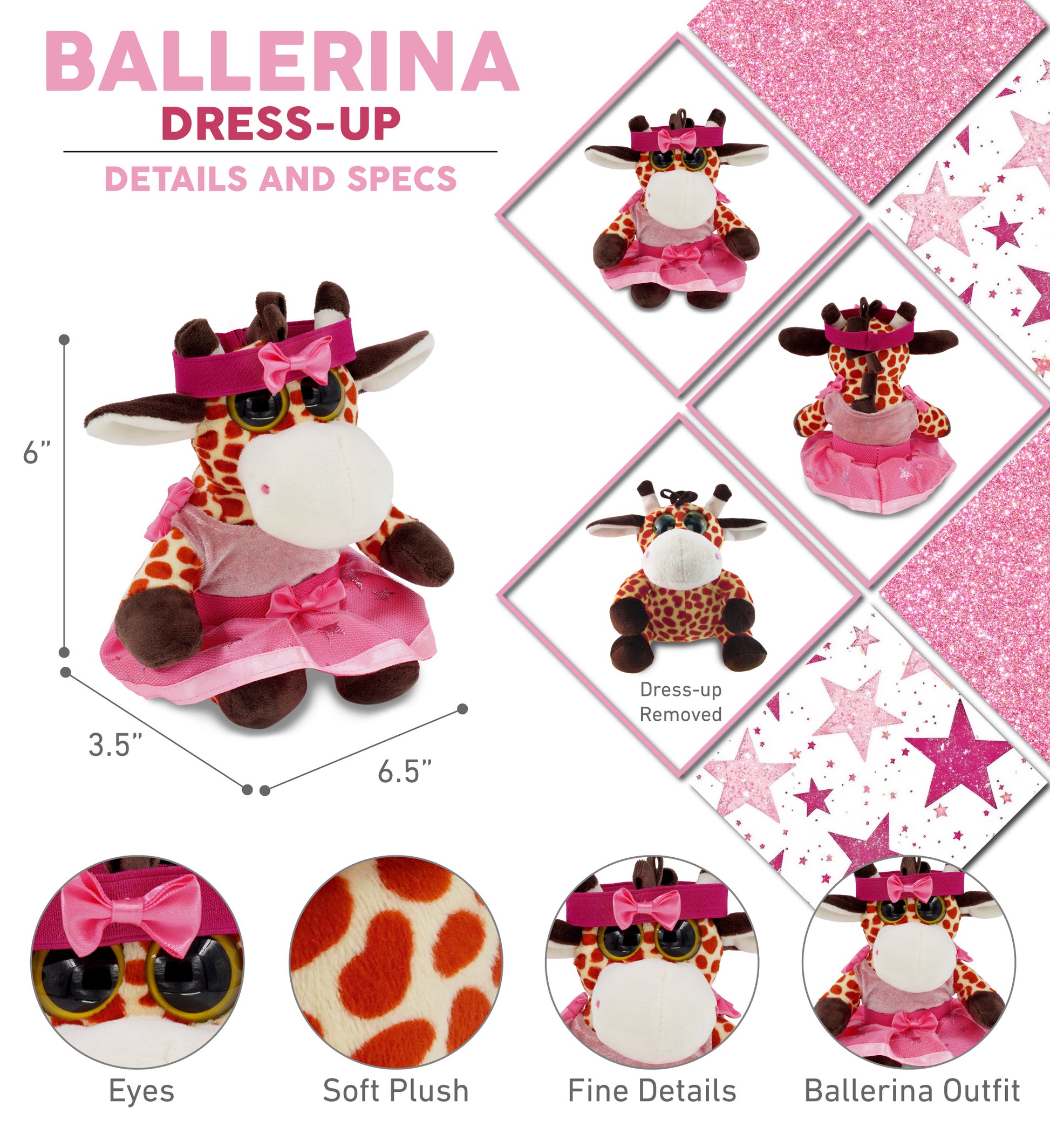 Includes 1 DolliBu Big Eye Giraffe Toy with Ballerina Costume - Includes one adorable stuffed animal giraffe doll dressed in a cute ballerina doll plush outfit, complete with a pink headband with a bow, tutu skirt, and a sleeveless top. This giraffe figure ballerina toy is designed to be display-worthy and a cuddle plush for girls. This cute plush ballerina doll measures approximately 6.5Lx3.5Wx6H inches and is best for kids ages 3 and up.