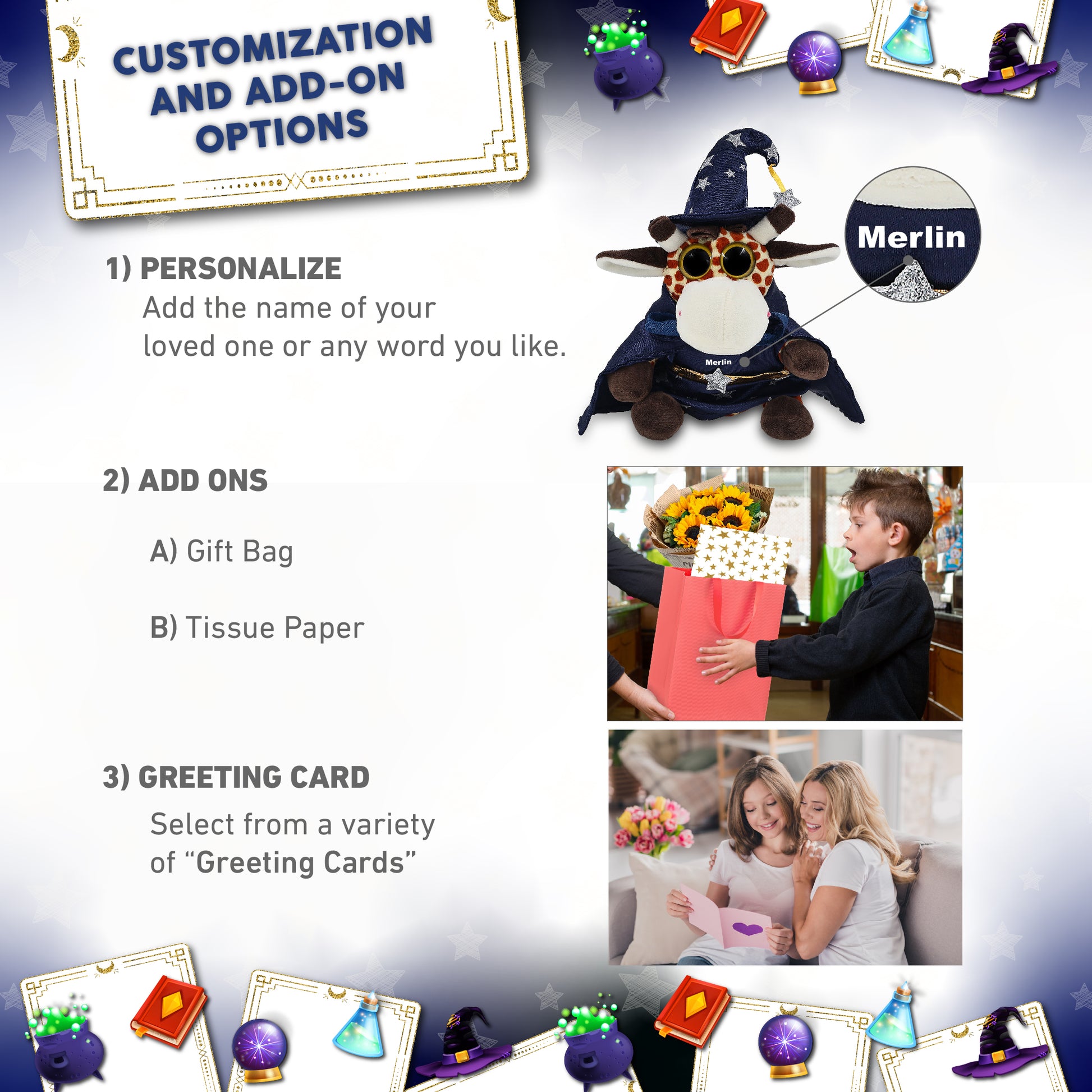 Personalization, Customization, and Add-On Options - The giraffe stuffed animal comes dressed in a complete wizard outfit, with a wizard cloak and hat with silver star details. Make your wizard stuffed giraffe special by adding a personalized name, which we will imprint onto the plush. You can customize your plush wizard toy by adding any of our add-ons to create the perfect gift: 1) Gift Bag 2) Tissue Paper 3) Greeting Card.