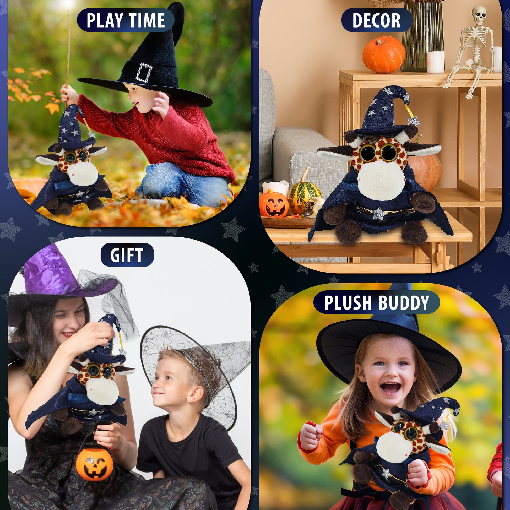 Features a Cute Giraffe Plush with Wizard Stuffed Animal Clothes - With a wizard cloak and wizard stuffed animal hat adorned with silver stars, this giraffe Halloween stuffed animal has a playful and stylish magical look! The detailed wizard fantasy outfit adds character to your stuffed toys and makes them stand out among other cute giraffe figures. Everyone will love to play with a huggable stuffed animal with wizard clothes for stuffed animals.