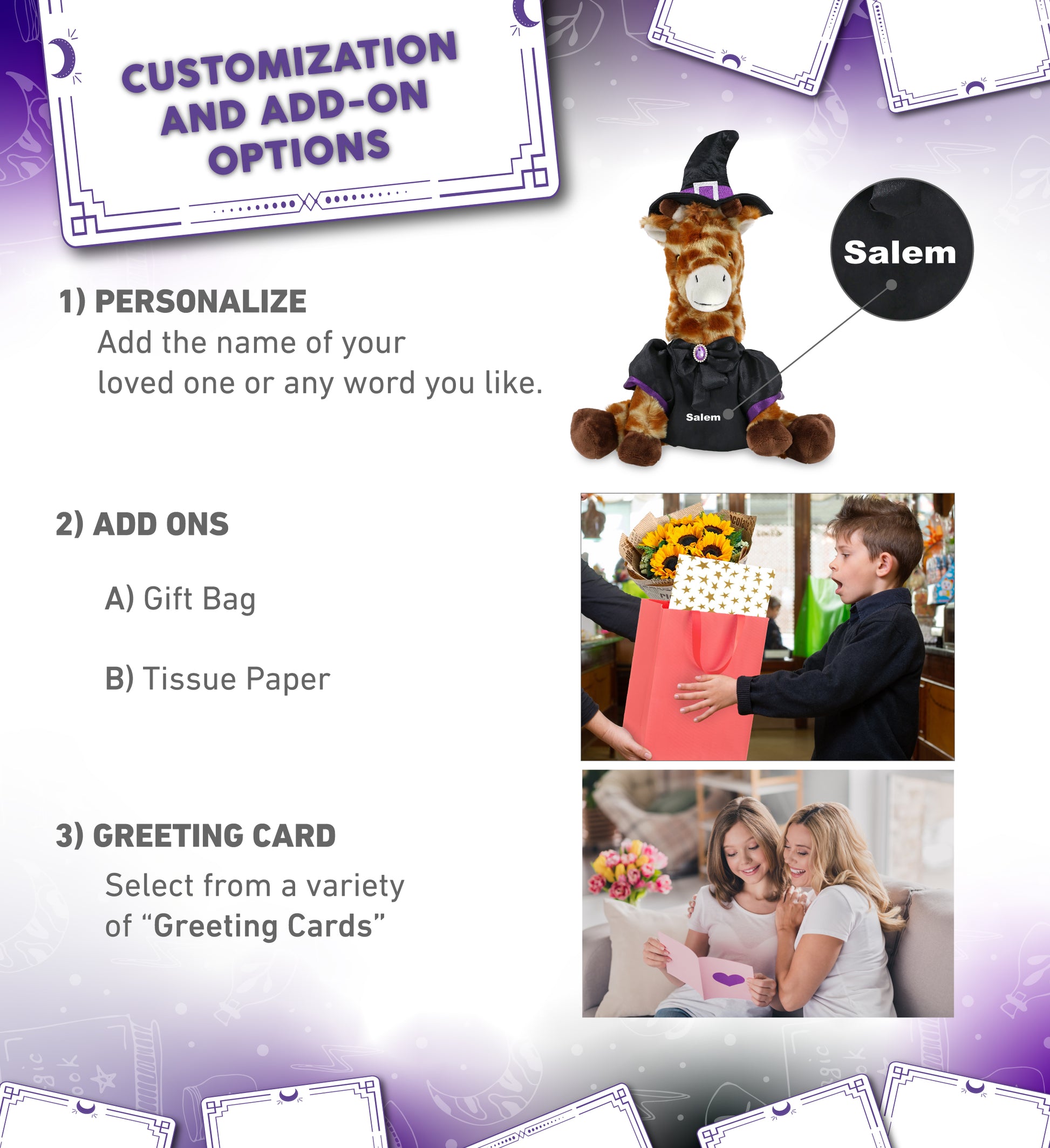 Personalization, Customization, and Add-On Options - The giraffe Halloween plush toy comes dressed in a witch outfit, complete with black and purple cloak and pointy black witch hat. Make your teddy bear doll special by adding a personalized name, which we will imprint onto the plush. You can also customize your witch giraffe stuffed animal by adding any of our add-ons to create the perfect gift: 1) Gift Bag 2) Tissue Paper 3) Greeting Card.