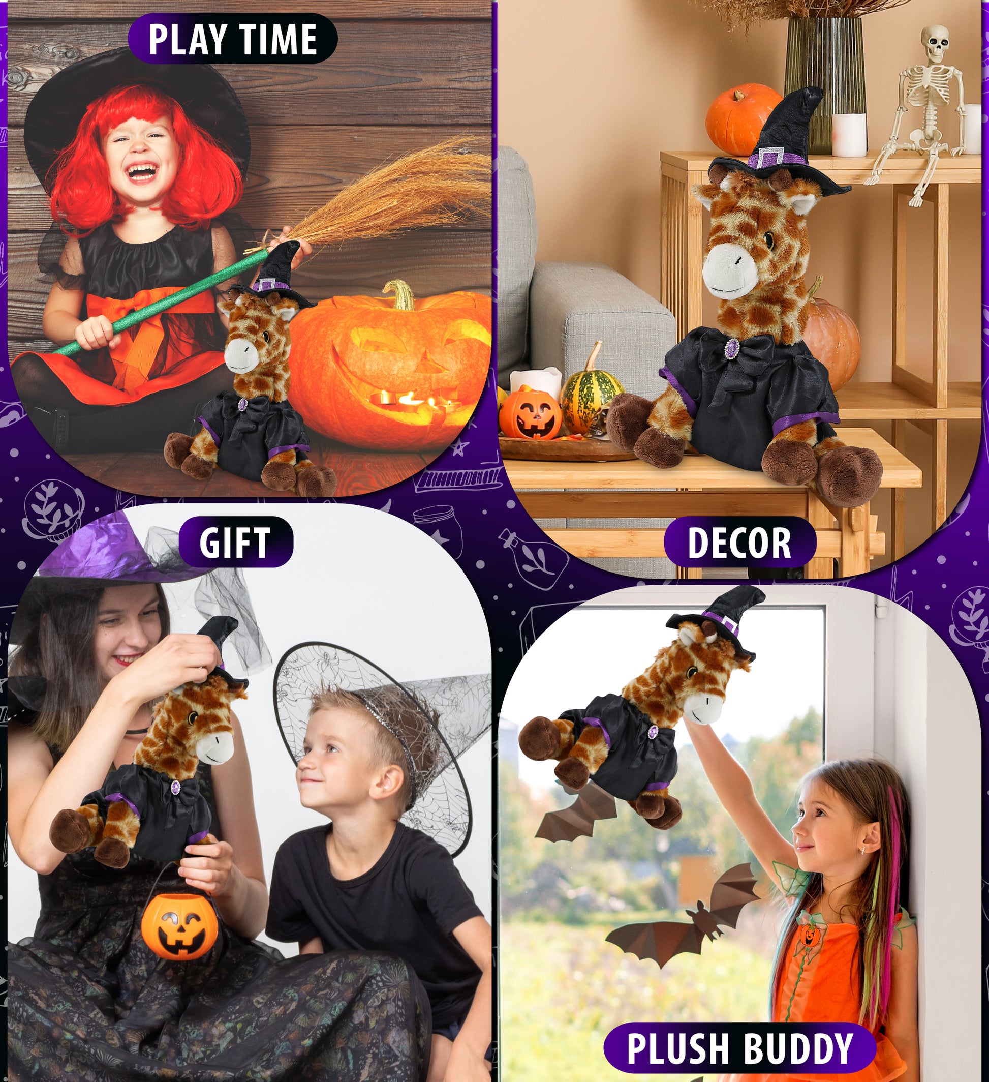 Perfect for Those Who Love Spooky Stuffed Animals - Everyone who loves spooky stuff and witch toys for girls and boys will be thrilled to get this giraffe stuffed animal with witch plush clothes. Perfect addition to your Halloween decor or as a spooky gift. Ideal Halloween themed gifts for fans of cute plush toys dressed up in clothes to dress and undress with a cute Halloween costume. Recommended for ages 3 and up.