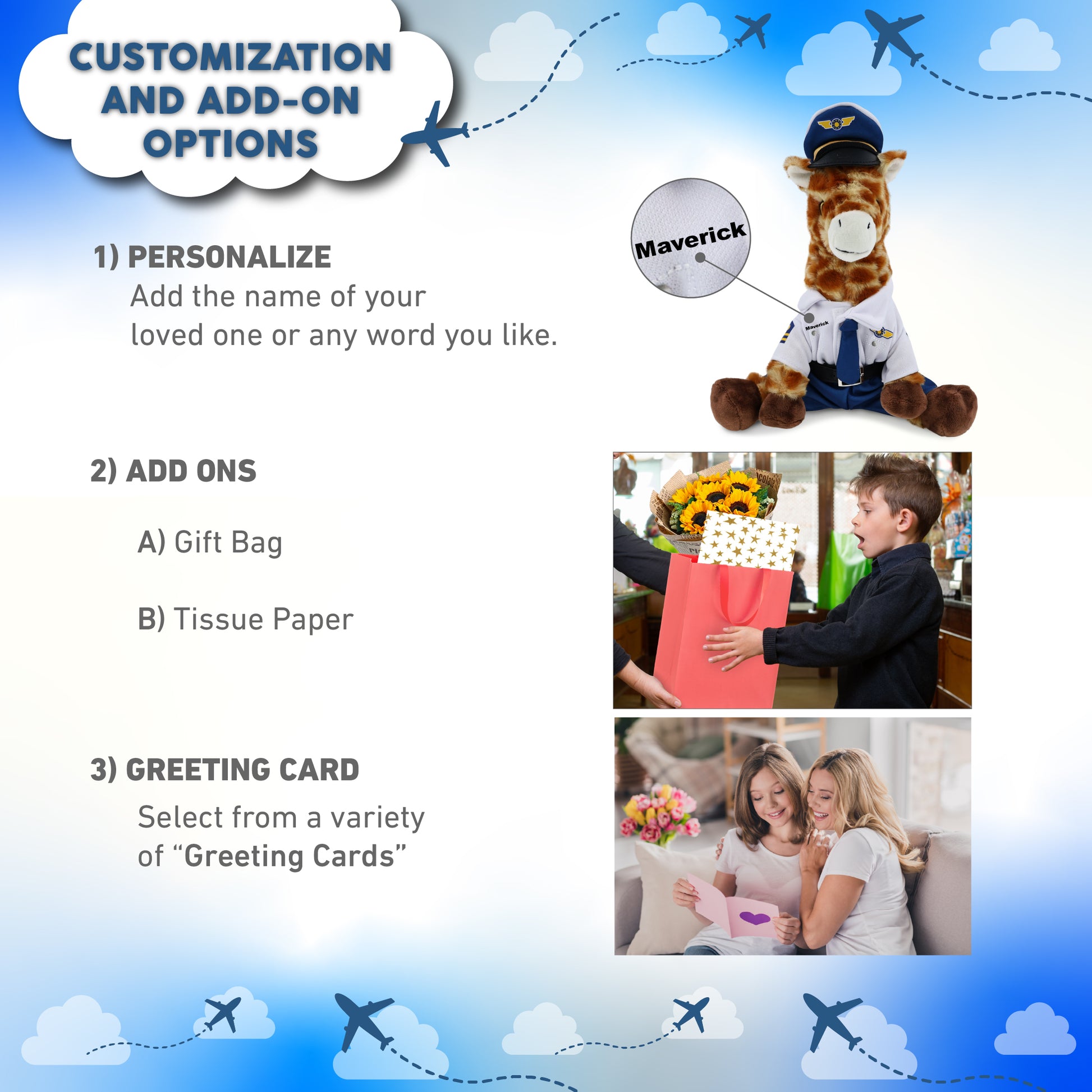 Personalization, Customization, and Add-On Options - The giraffe stuffed animal comes dressed in a full pilot outfit set, with a white pilot shirt, captain hat, belt, and pants. Make your pilot stuffed bear special by adding a personalized name, which we will imprint onto the plush. You can customize your plush pilot toy by adding any of our add-ons to create the perfect gift: 1) Gift Bag 2) Tissue Paper 3) Greeting Card.