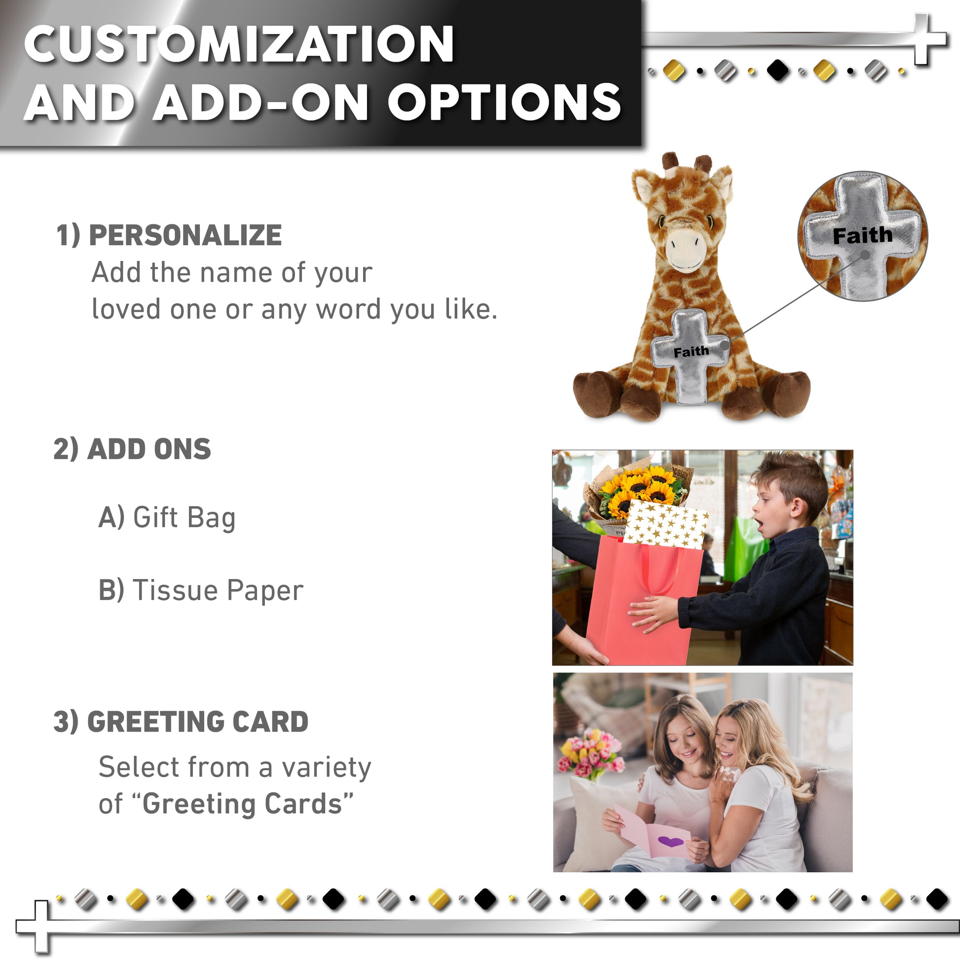 Personalization, Customization, and Add-On Options - Super Soft Eco-Friendly Giraffe stuffed animal bear comes customized with a shiny metallic cross. You can turn it into a personalized teddy bear with the name of a loved one, or add any word which we will imprint on the item. And last, you have the option to add some or all of the cool add-ons to make your gift extra special: 1) Gift Bag 2) Tissue Paper 3) Greeting Card.