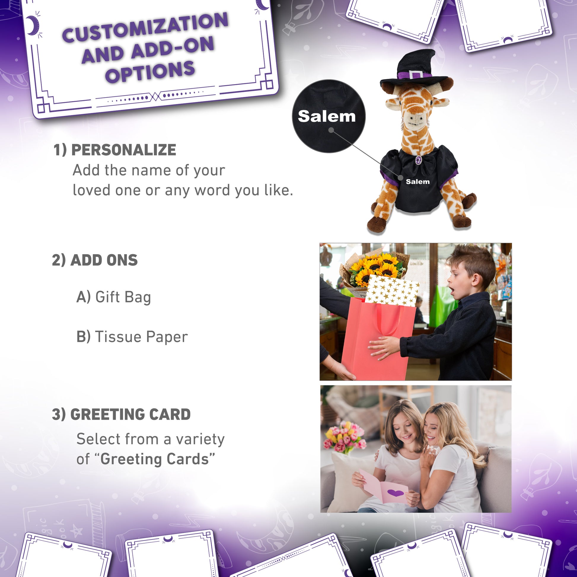 Personalization, Customization, and Add-On Options - The giraffe Halloween plush toy comes dressed in a witch outfit, complete with black and purple cloak and pointy black witch hat. Make your teddy bear doll special by adding a personalized name, which we will imprint onto the plush. You can also customize your witch giraffe stuffed animal by adding any of our add-ons to create the perfect gift: 1) Gift Bag 2) Tissue Paper 3) Greeting Card.