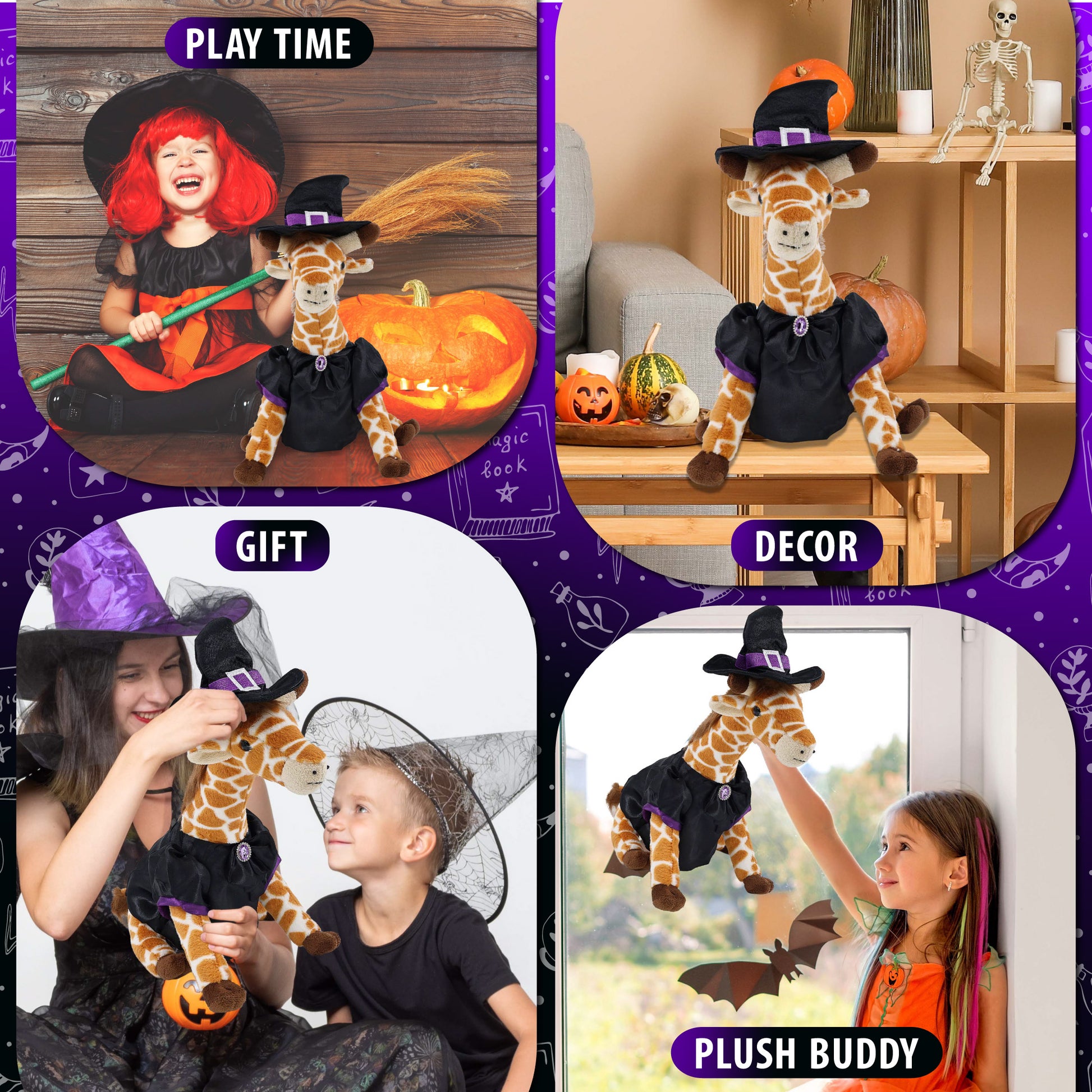 Features a Teddy Bear Halloween Plush Wearing Witch Plush Doll Clothes - This cute witch giraffe stuffed toy comes dressed in a soft black satin witch doll dress with purple trim and a shiny gem-accented bow. It also wears a pointy black witch hat decor with a silver buckle and purple band, completing the spooky Halloween teddy bear look. The giraffe plush toy witch costume is removable and fits snugly on the giraffe Halloween witch doll.