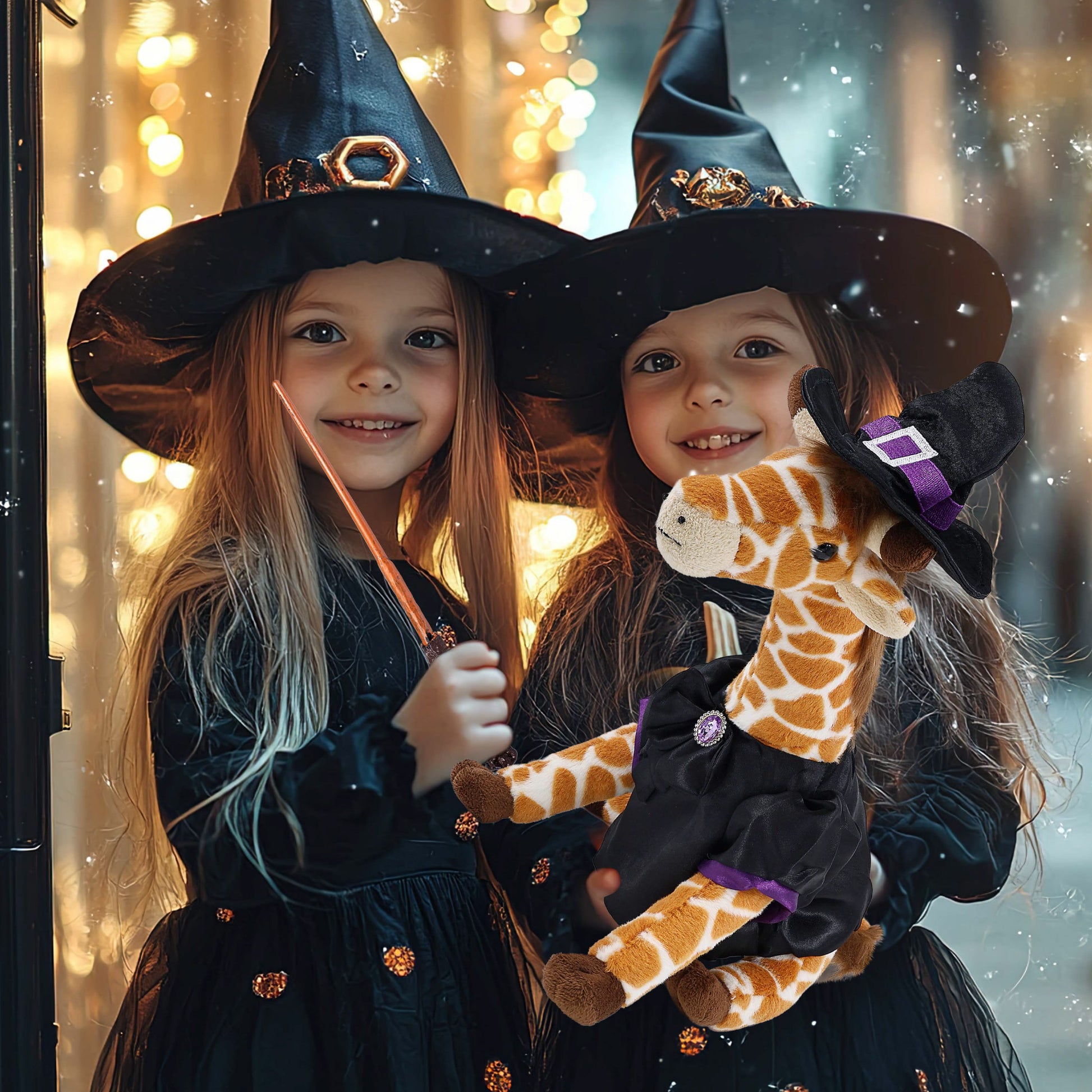 Everyone who loves witch stuff and stuffed witch dolls for kids will be thrilled to get this giraffe stuffed animal with witch costume. Perfect addition to your Halloween stuffed toys and witch doll decor. Ideal Halloween themed gifts for fans of cute Halloween themed plush toys, giraffe themed gifts, witch toys, and collectors of spooky toys for kids. This cute witch stuffed giraffe plush comes dressed in a soft black satin witch doll dress with purple trim and a shiny gem-accented bow. It also wears a pointy black hat witch accessory, designed with a silver buckle and purple band, completing the spooky Halloween teddy bear look. The plush Halloween giraffe witch costume is removable and fits snugly on the giraffe witch spooky plush. The giraffe Halloween plush toy comes dressed in a witch outfit, complete with a black cloak and a pointy black witch hat. Make your teddy bear doll special by adding a personalized name, which we will imprint onto the plush. You can also customize your witch giraffe stuffed animal by adding any of our add-ons to create the perfect gift: 1) Gift Bag 2) Tissue Paper 3) Greeting Card. The cute Halloween stuffed animal plush giraffe with a witch black hat and cloak is made with super-soft, durable, premium-quality polyester materials. The witch doll for kids is designed for everyday hugs and creative dress-up fun, blending witch style with fun animal charm. The witch stuffed Halloween plush clothes include a hook and loop tape fastener on the back of the suit for quick and easy dressing. The plush teddy bear arrives with a cute dress for a witch. The witch stuffed giraffe toy features a black witch dress up set with intricate purple details and a black bow with a gem. The perfect teddy bear plush that measures 10Lx4Wx12.5H inches to add spooky vibes to a display, along with your other Halloween stuffed animals. A cute witch Halloween teddy bear plush for anyone ages 3 and up who is looking for a cute giraffe figure.