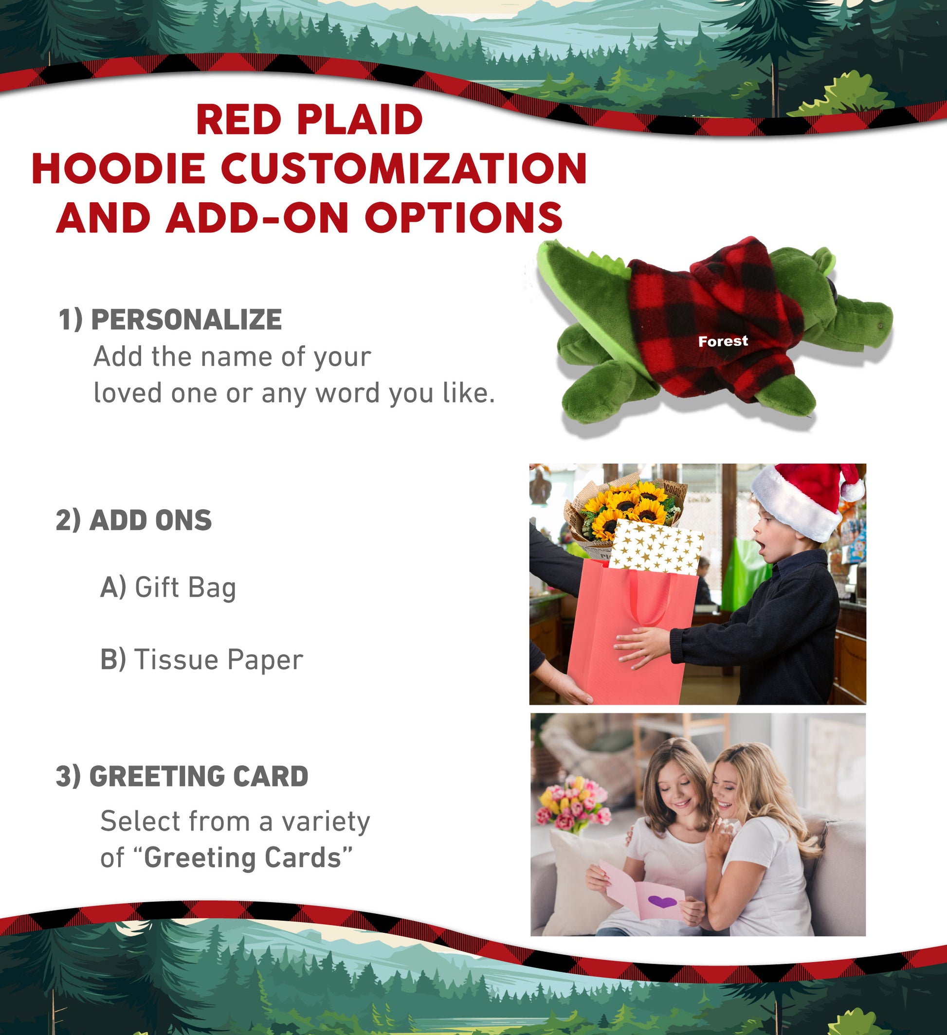 PERSONALIZATION, CUSTOMIZATION, AND ADD-ON OPTIONS - The Super Soft Big Eye Alligator Stuffed Animal comes dressed in a cozy teddy bear costume, a red plaid hoodie. Make your gator plush more special by personalizing it with the name of your loved one, which we will print directly onto the plush. You can also customize your plush gator by adding any of our unique add-ons to create the perfect gift: 1) Gift Bag 2) Tissue Paper 3) Greeting Card.