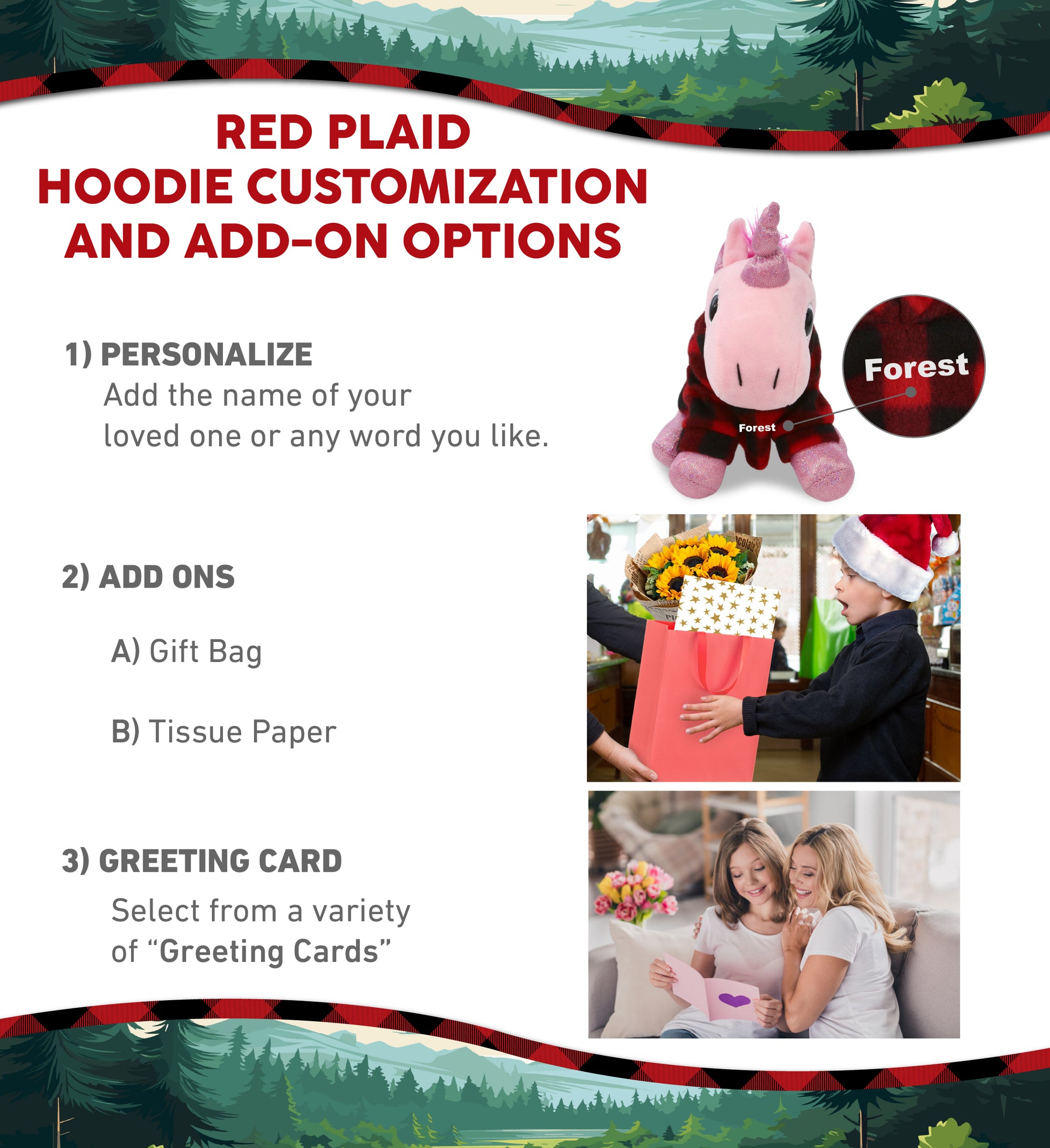 PERSONALIZATION, CUSTOMIZATION, AND ADD-ON OPTIONS - The Sparkle Eyes Unicorn Stuffed Animal comes dressed in a cozy teddy bear costume, a red plaid hoodie. Make your unicorn plush more special by personalizing it with the name of your loved one, which we will print directly onto the plush. You can also customize your plush unicorn by adding any of our unique add-ons to create the perfect gift: 1) Gift Bag 2) Tissue Paper 3) Greeting Card.