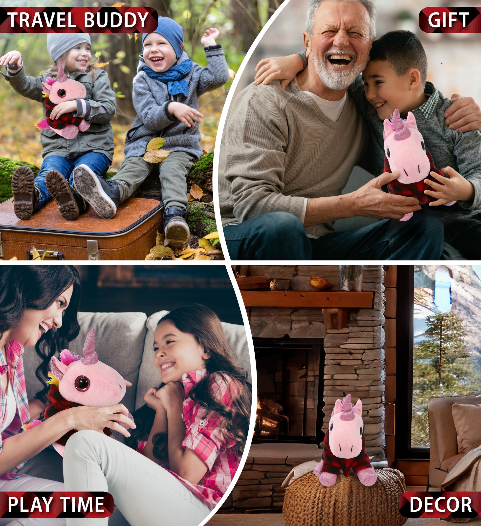 IDEAL USE FOR THE UNICORN WITH PLUSH CLOTHES - The unicorn winter plush is the ultimate stuffed teddy bear cuddle buddy! Whether it’s on a shelf as holiday decor or a Christmas teddy bear gift, this unicorn adds a touch of winter warmth wherever it goes. With its red plaid shirt, the unicorn plush is great for winter nights and joyful holiday memories. Warm your home this winter season with cute stuffed animals wearing red plaid flannel shirt.