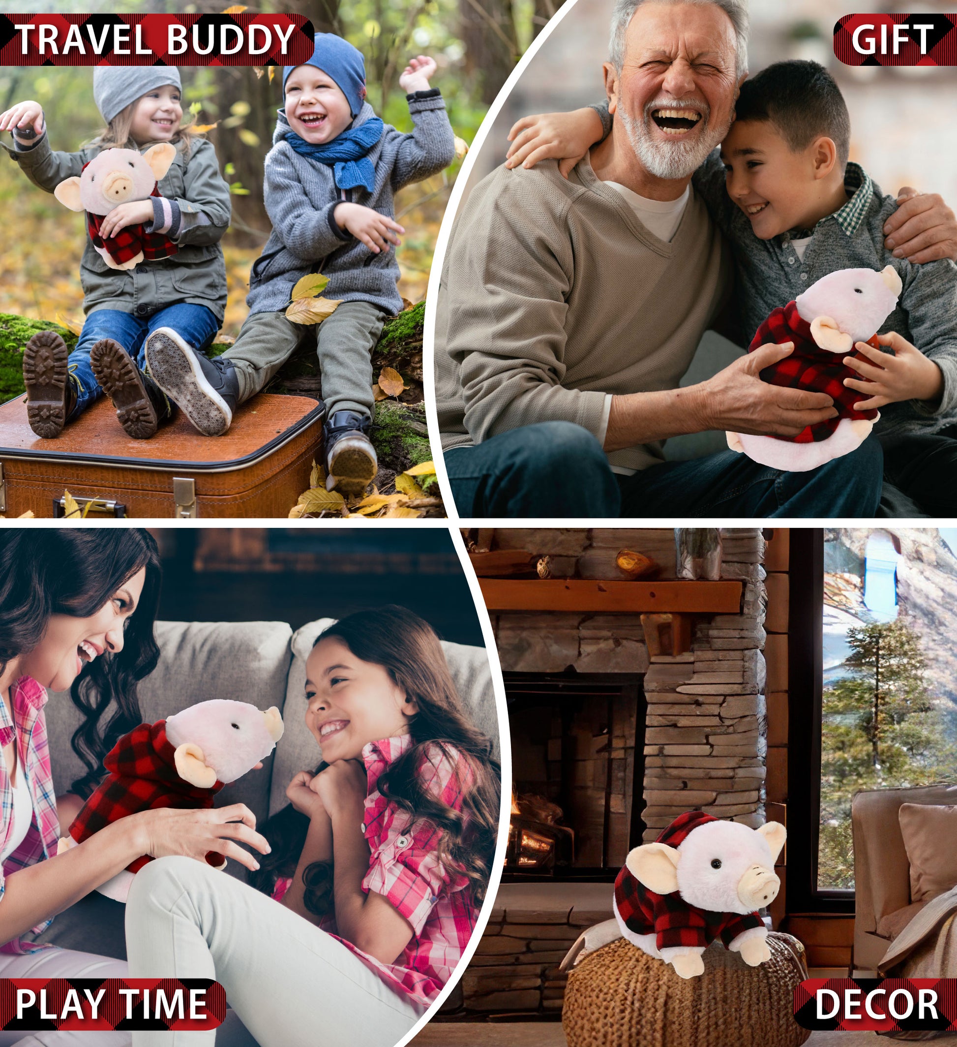 HIGH-QUALITY LUMBERJACK STUFFED ANIMAL - The piggy stuffed toy is made from high-quality 100% polyester to ensure long-lasting comfort and durability, making it a perfect holiday buddy. It's black and red flannel shirt, paired with a soft plaid hoodie, gives this plush a festive, wintery look that’s perfect for holiday decor or as a thoughtful stuffed animal Christmas gift for loved ones. A heartwarming addition to your holiday traditions!