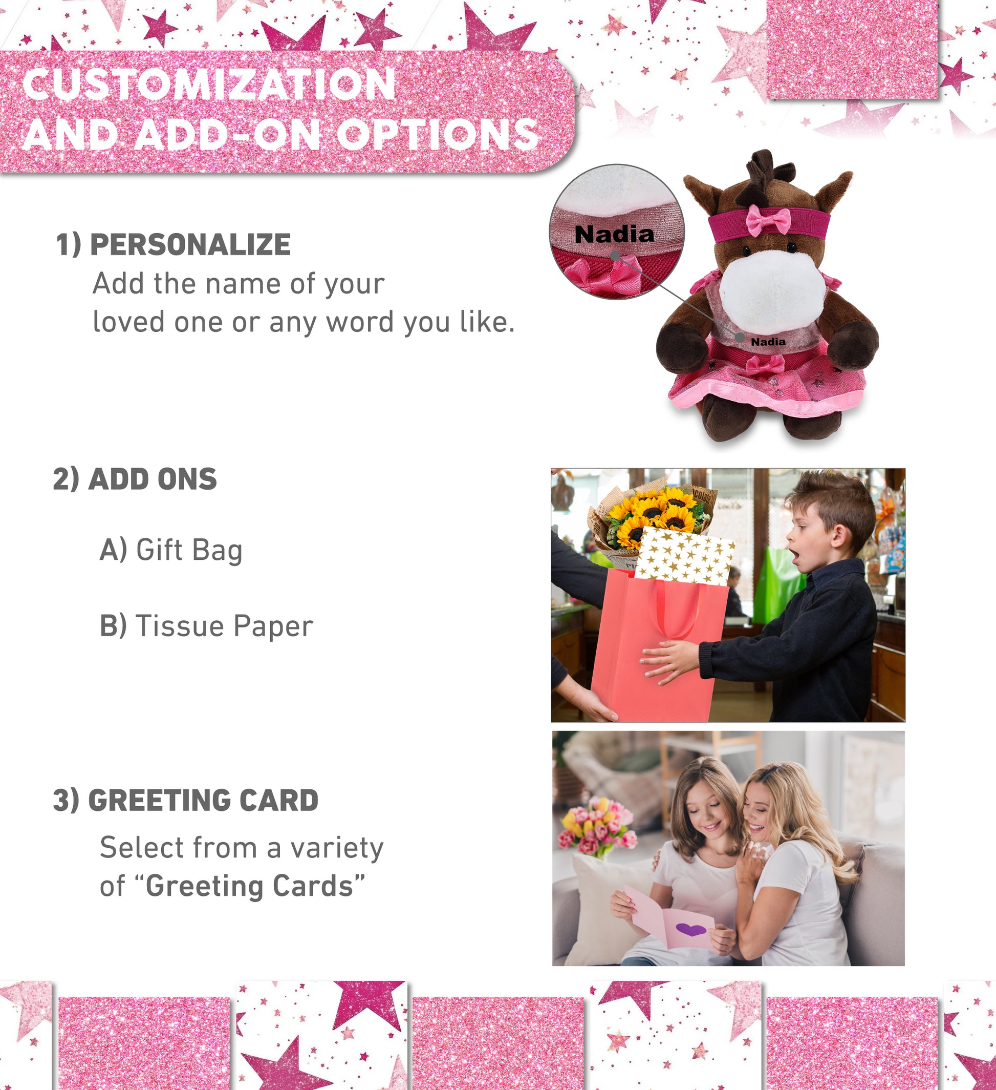 Personalization, Customization, and Add-On Options - The horse plush toy comes dressed in a charming pink ballerina outfit, complete with tutu skirt, headband, and shirt. Make it meaningful by personalizing it with the name, which we will imprint directly onto the plush. You can also customize your ballerina horse stuffed animal doll by adding any of our add-ons to create the perfect gift: 1) Gift Bag 2) Tissue Paper 3) Greeting Card.