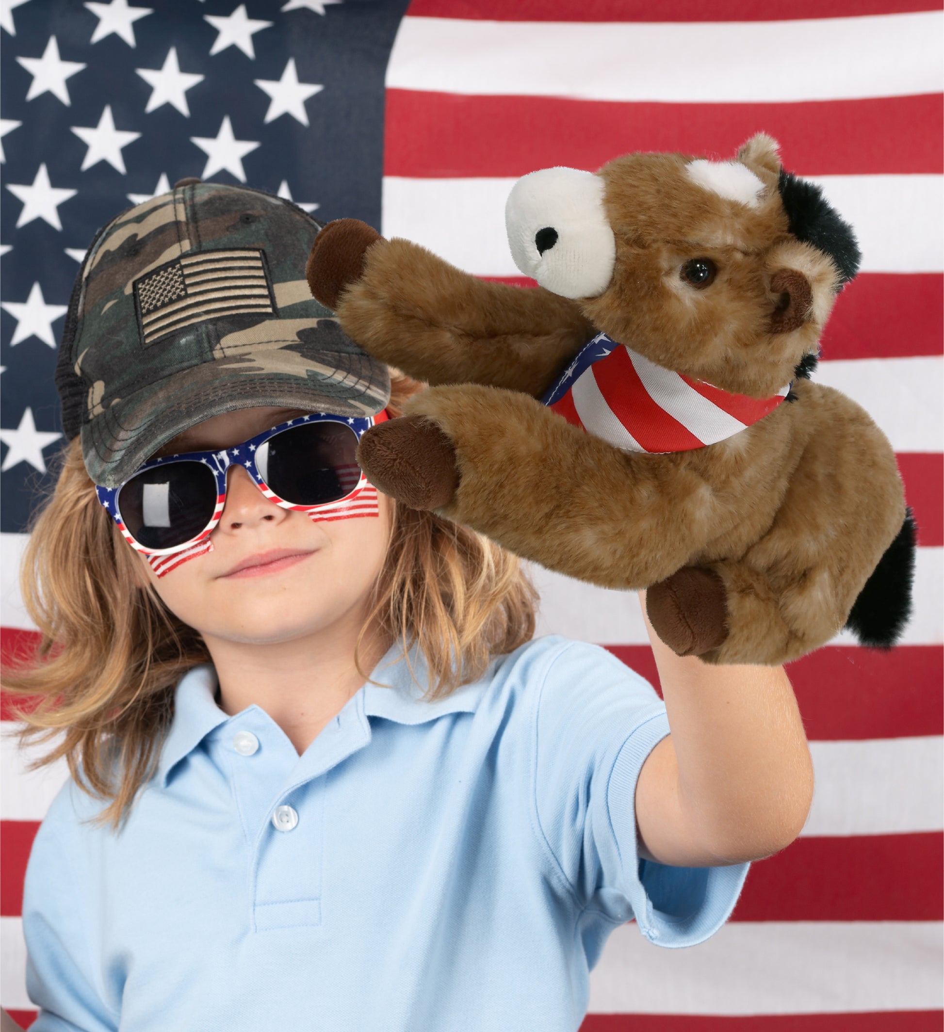 Includes 1 DolliBu Lying Brown Horse Toy with USA Flag Bandana Dress Up Set - The stuffed animal horse arrives with a removable red, white and blue USA flag bandana, making it a standout among stuffed animals with clothes. Turn your classic teddy bear horse into collectible patriotic stuffed animal perfect for celebrating USA holidays. The horse stuffed animal measures 10.5Lx4.5Wx6H inches and is for kids ages 0 and up.