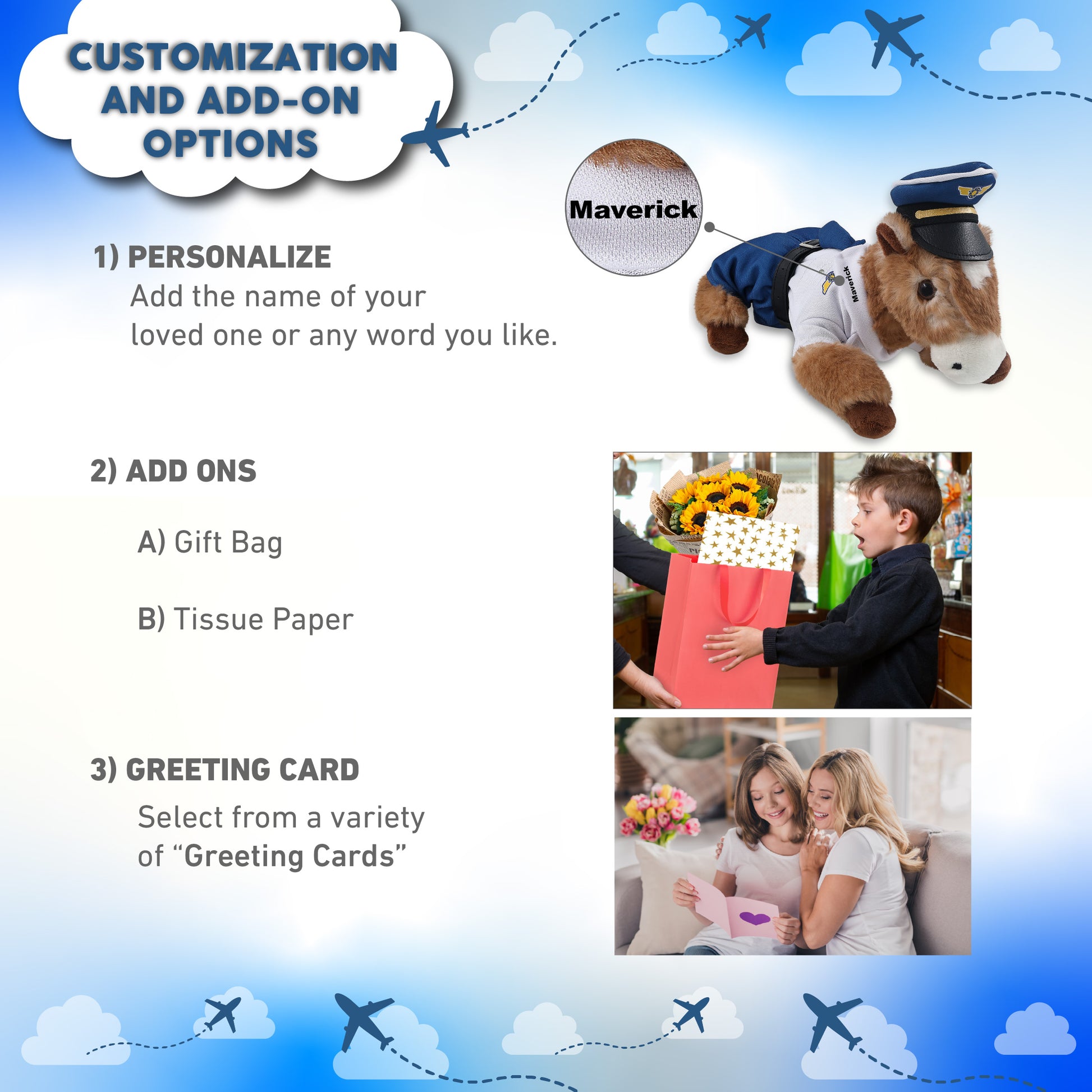 Personalization, Customization, and Add-On Options - The horse stuffed animal comes dressed in a full pilot outfit set, with a white pilot shirt, captain hat, belt, and pants. Make your pilot stuffed bear special by adding a personalized name, which we will imprint onto the plush. You can customize your plush pilot toy by adding any of our add-ons to create the perfect gift: 1) Gift Bag 2) Tissue Paper 3) Greeting Card.