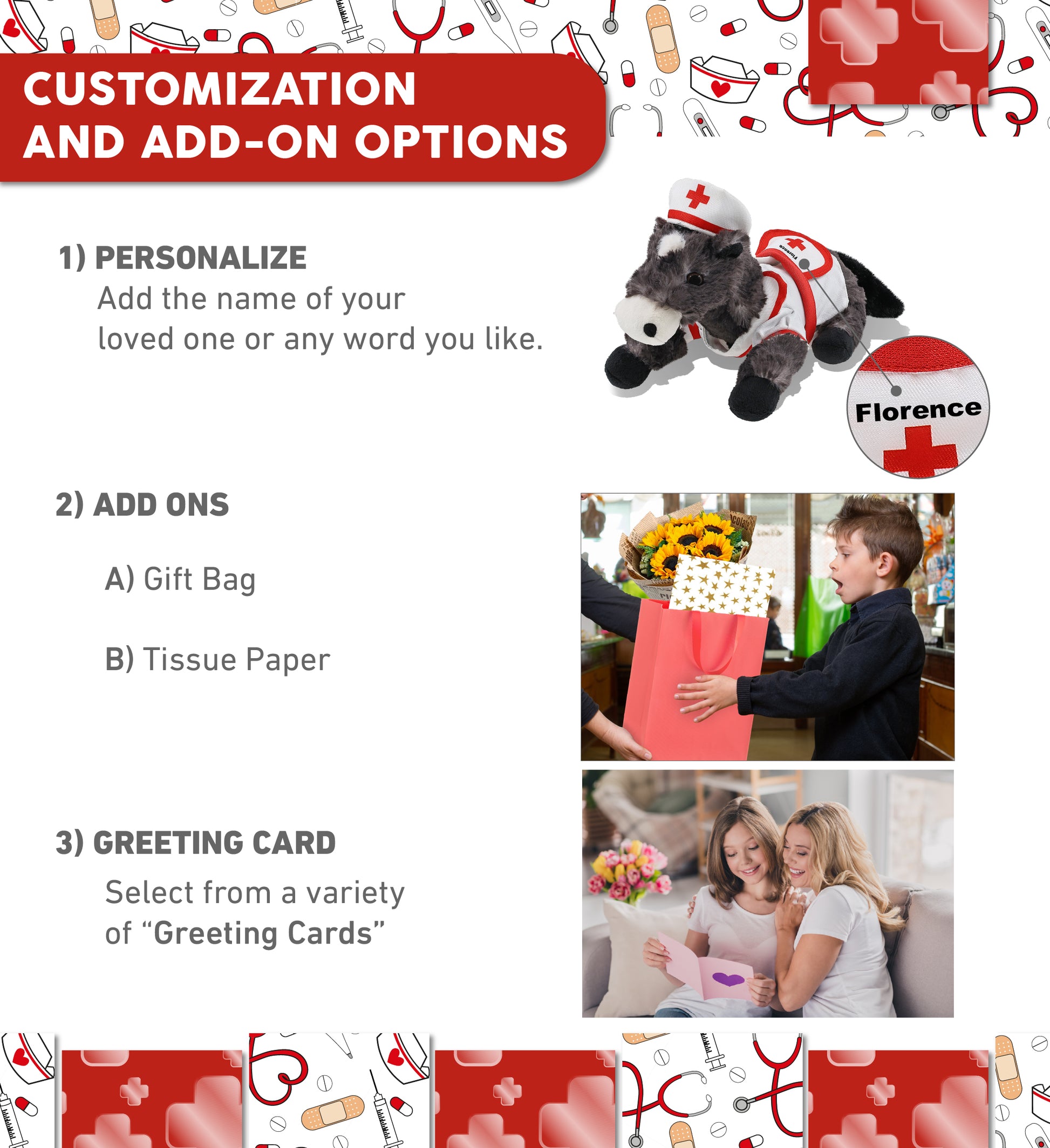 Personalization, Customization, and Add-On Options - The stuffed Horse comes dressed in a cute nurse costume, complete with nurse cap, nurse dress and apron. Make your nurse teddy bear stuffed animal plush special by adding a personalized name, which we'll imprint onto the plush. You can also customize your nurse horse plush by adding any of our add-ons to create the perfect gift: 1) Gift Bag 2) Tissue Paper 3) Greeting Card.