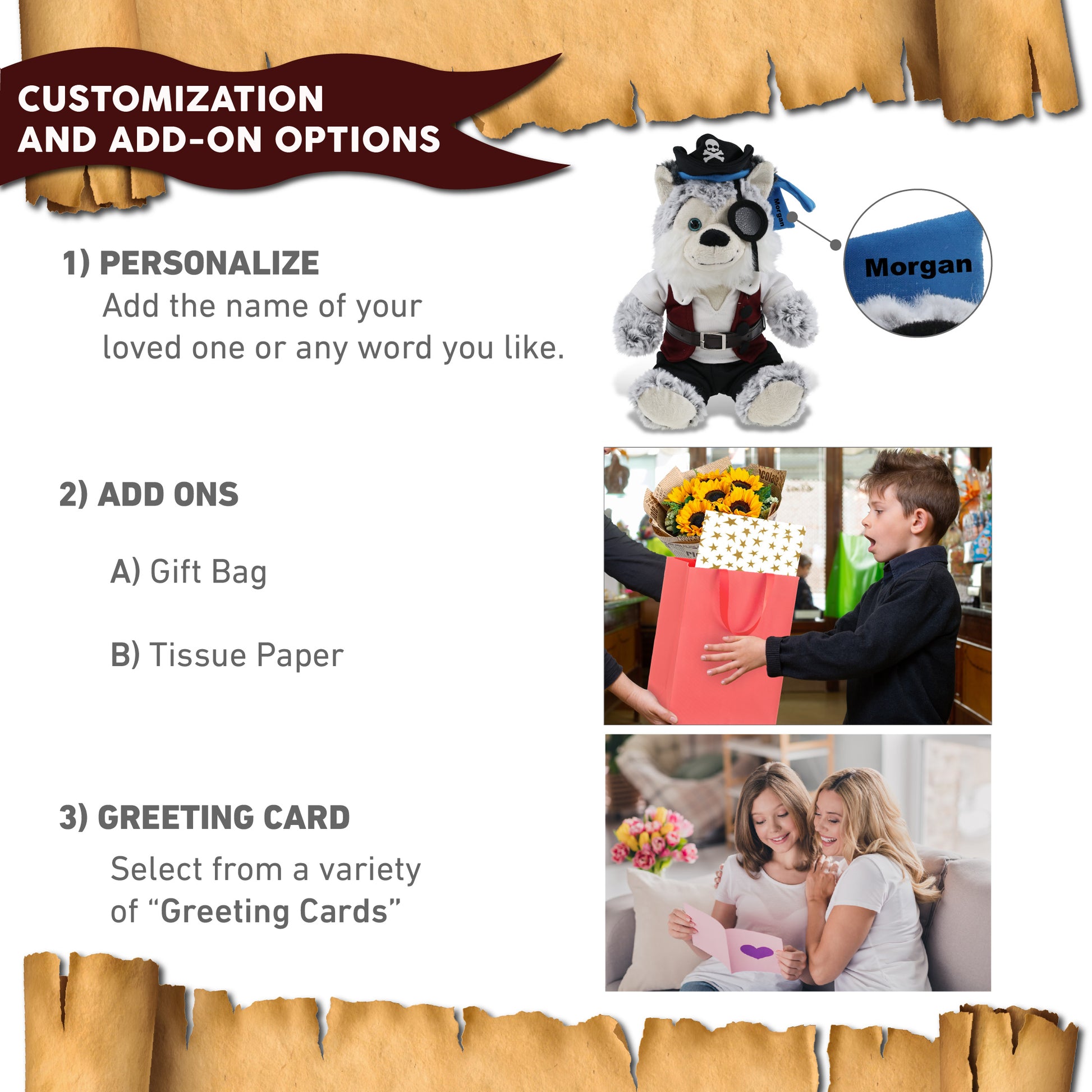- Personalization, Customization, and Add-On Options - The husky figure stuffed toy comes dressed in full pirate clothes, complete with pirate hat, pirate vest, pirate shirt, pants, belt, and pirate mask. Make your bear doll special by adding a personalized name, which we will imprint onto the plush. You can also customize your stuffed animal by adding any of our add-ons to create the perfect gift: 1) Gift Bag 2) Tissue Paper 3) Greeting Card.