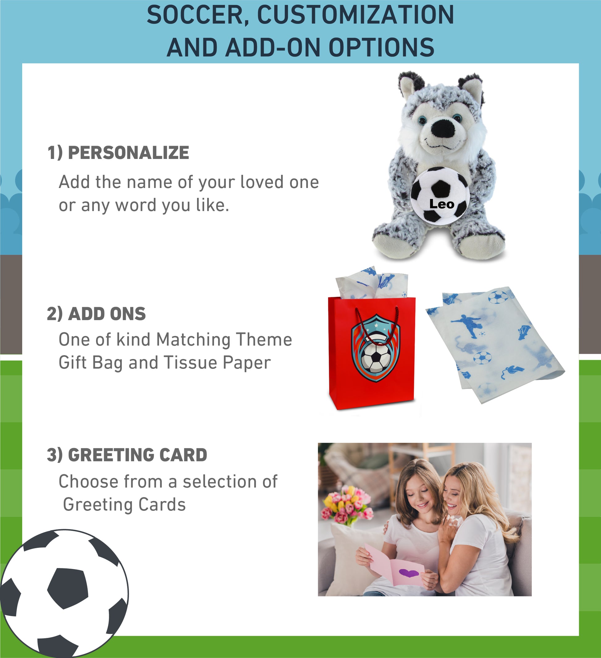 PERSONALIZATION, CUSTOMIZATION, AND ADD-ON OPTIONS - Super Soft Sports Stuffed Animal Sitting Husky comes customized with a Soccer Ball Plush. You can personalize it with the name of your loved one imprinted on the item. You also have the option to add some or all of the cool add-ons to make your gift extra special: 1) Gift Bag; 2) Tissue Paper; 3) Greeting Card.