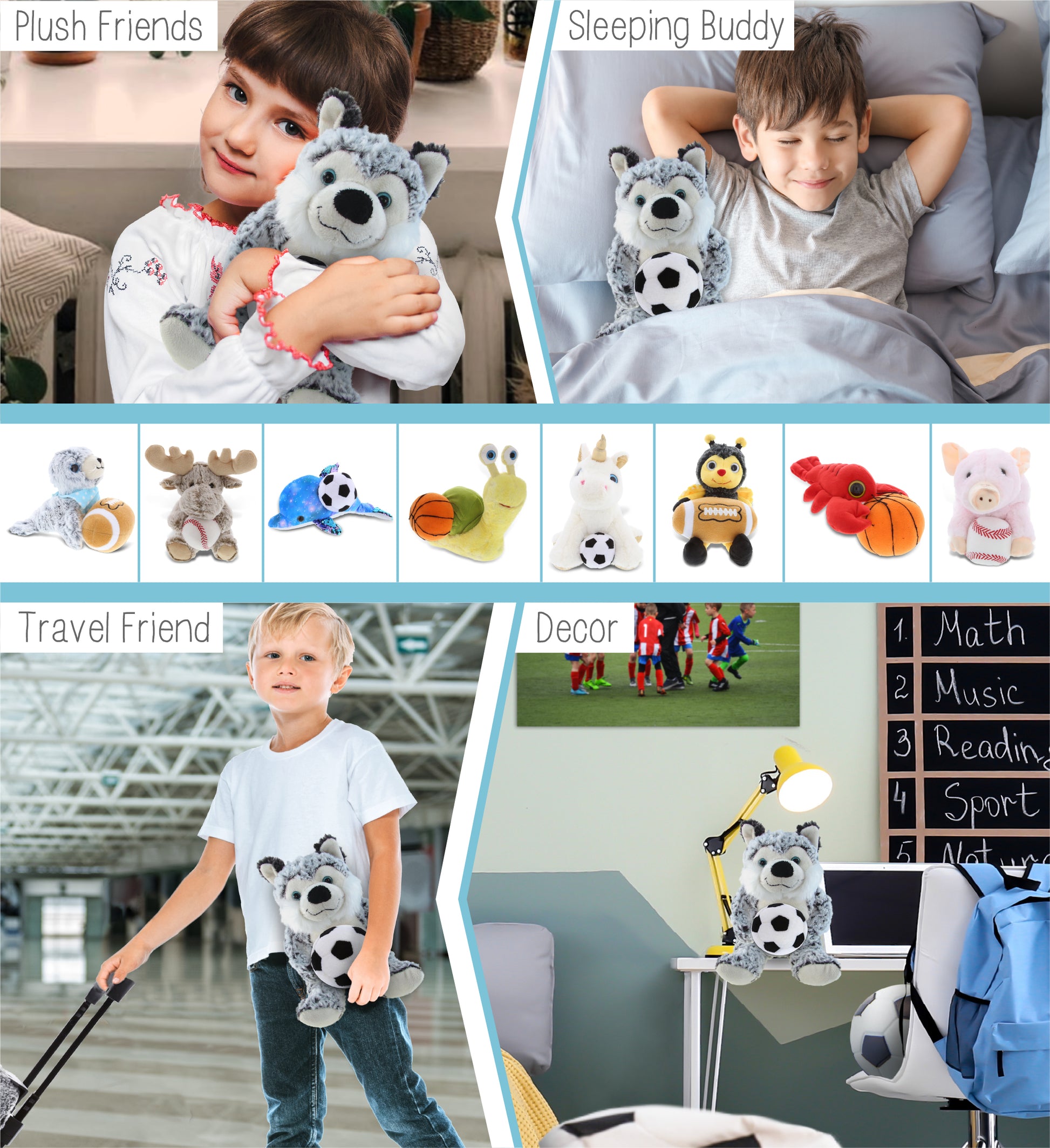 HIGH QUALITY SUPER SOFT PLUSH STUFFED ANIMAL - The machine-sewn husky toy plush and soccer ball is made of premium-quality polyester, stuffed with soft fluffy polyester fillings. Made with durable and child-friendly features. Cute and snuggly husky sitting down upright. Cute soft toys designed to be your little one's best buddies. To maintain fluffy stuffed animals, wash husky plush toys with cold soapy water and allow it to air dry.