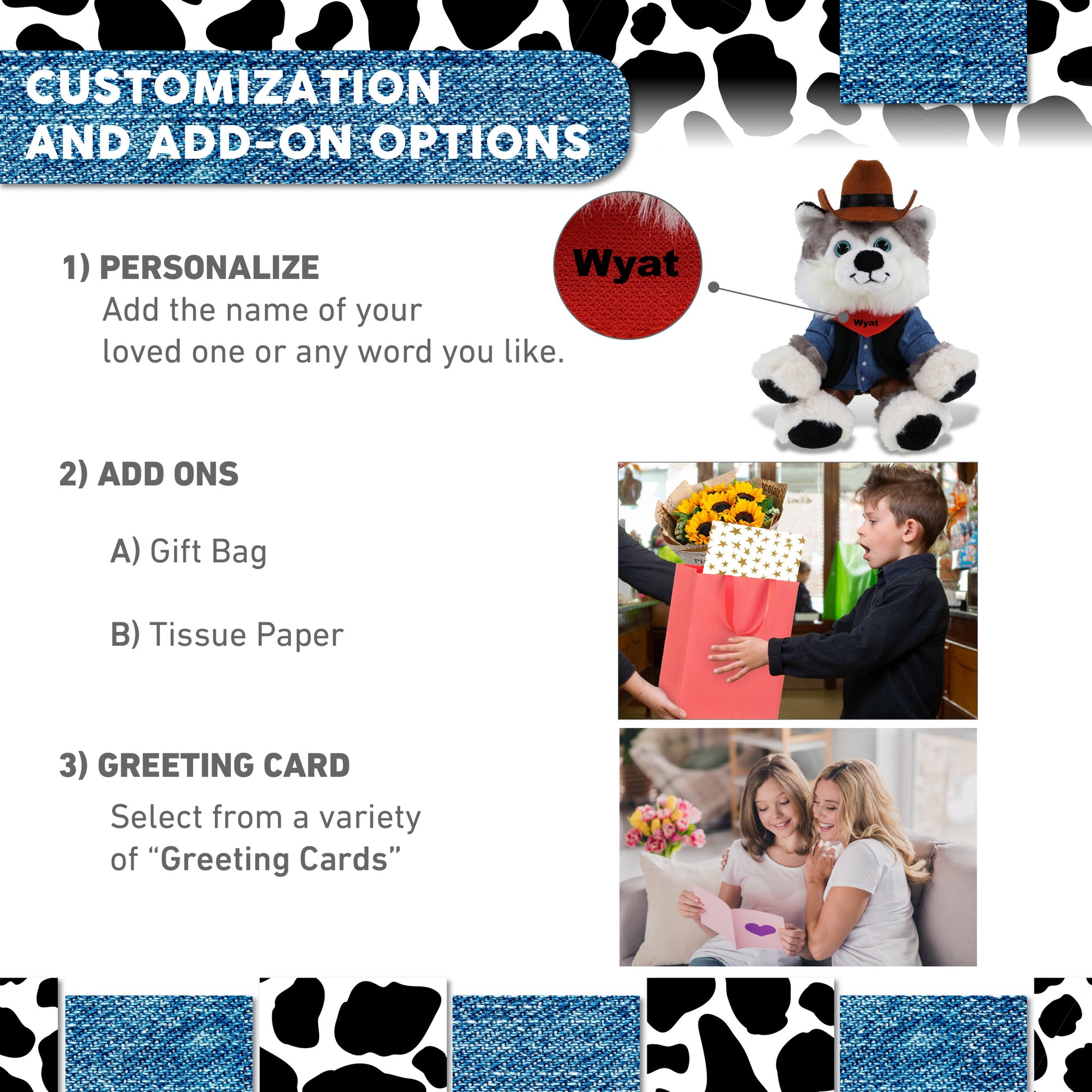 Personalization, Customization and Add-On Options - The husky stuffed animal plush comes dressed in a cowboy outfit, complete with cowboy vest shirt, pants, bandana, and cowboy hat. Make it cool by personalizing it with the name, which we will imprint directly onto the stuffy plush. You can also customize your cowboy plush husky by adding any of our add-ons to create the perfect gift: 1) Gift Bag 2) Tissue Paper 3) Greeting Card.