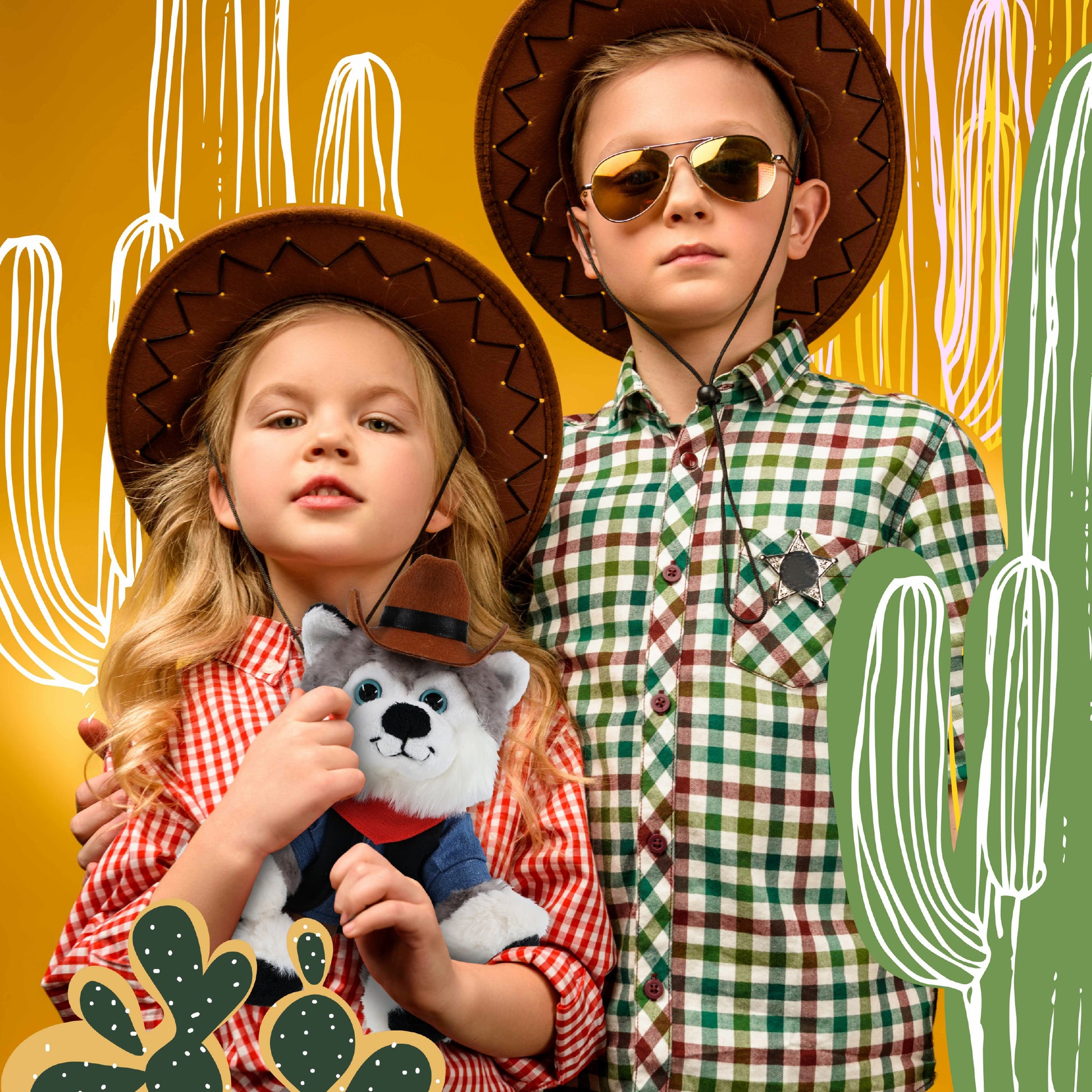 Husky with Western Outfit Features Realistic Details from its Cowboy Hat to Leather Chaps - From its doll cowboy hat to detailed outfit, this husky figure rocks a look that’s both fun and stylish. The combo of husky toy and cowboy accessories creates two playful themes, wildlife and the Wild West. The plush husky with cowboy bear outfit makes the perfect addition to your collection of plush toys and cool stuffed animal clothing.