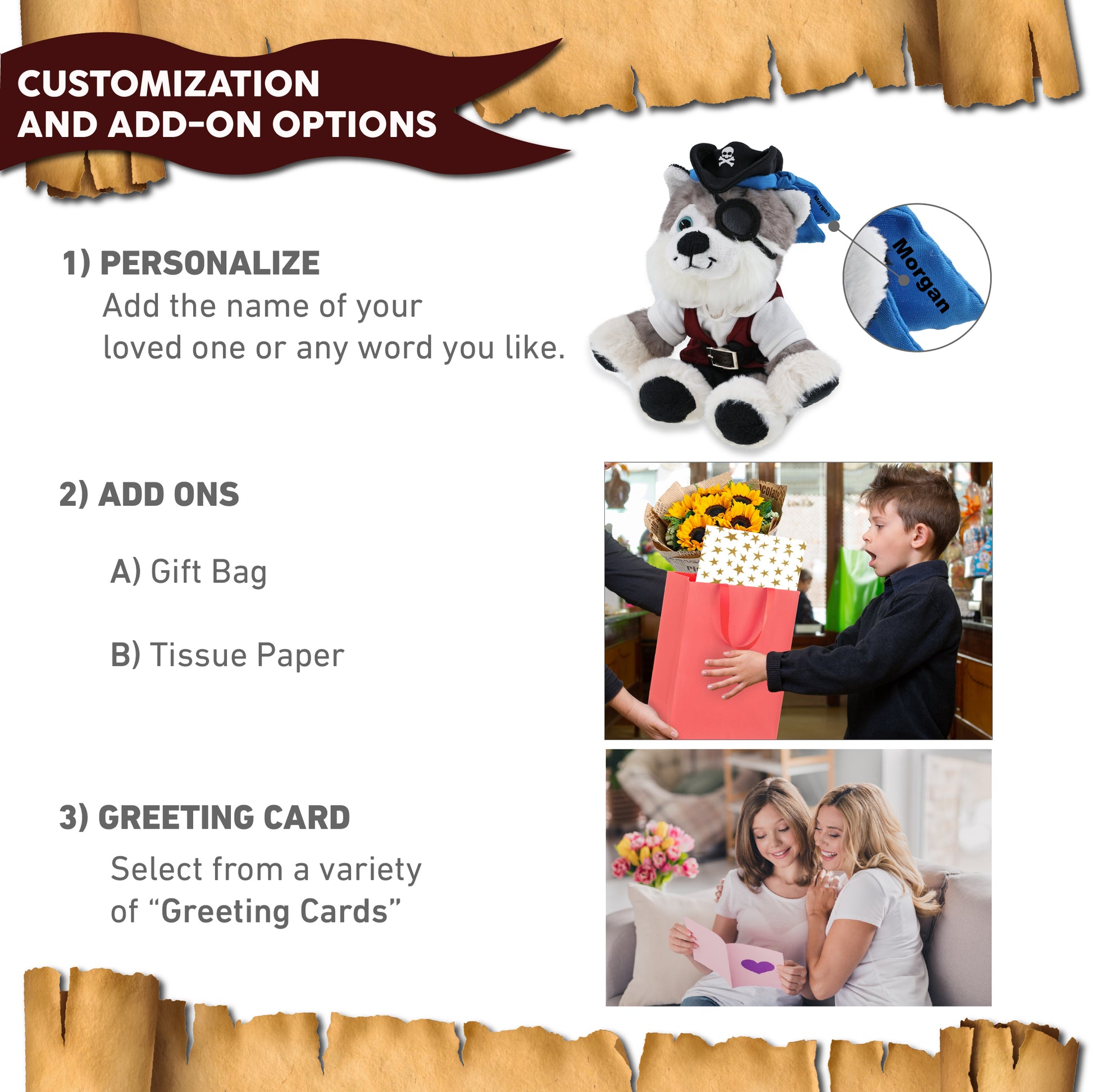 - Personalization, Customization, and Add-On Options - The husky figure stuffed toy comes dressed in full pirate clothes, complete with pirate hat, pirate vest, pirate shirt, pants, belt, and pirate mask. Make your bear doll special by adding a personalized name, which we will imprint onto the plush. You can also customize your stuffed animal by adding any of our add-ons to create the perfect gift: 1) Gift Bag 2) Tissue Paper 3) Greeting Card.