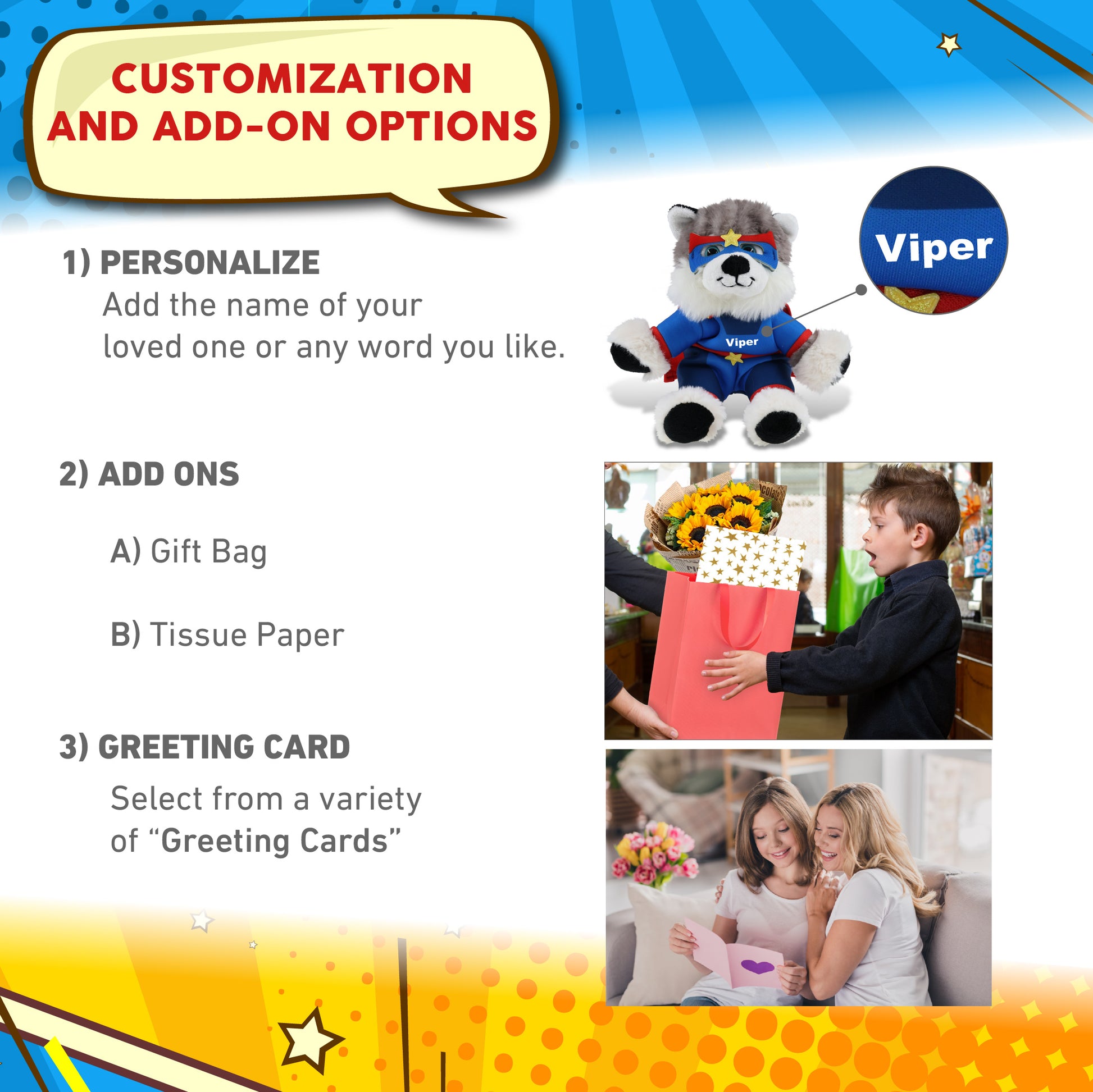 Personalization, Customization, and Add-On Options - The Floppy husky stuffed animal comes dressed in a full superhero outfit, complete with eye mask, suit with cape, and star details. Make your super hero husky toy special by adding a personalized name, which we will imprint onto the plush. You can also customize your plush hero toy by adding any of our add-ons to create the perfect gift: 1) Gift Bag 2) Tissue Paper 3) Greeting Card.