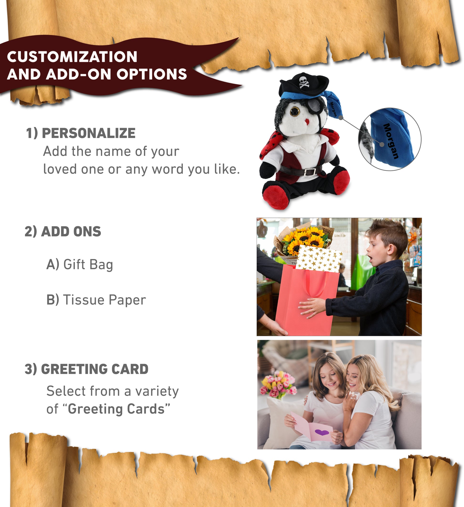 - Personalization, Customization, and Add-On Options - The ladybug figure stuffed toy comes dressed in full pirate clothes, complete with pirate hat, pirate vest, pirate shirt, pants, belt, and pirate mask. Make your bear doll special by adding a personalized name, which we will imprint onto the plush. You can also customize your stuffed animal by adding any of our add-ons to create the perfect gift: 1) Gift Bag 2) Tissue Paper 3) Greeting Card.