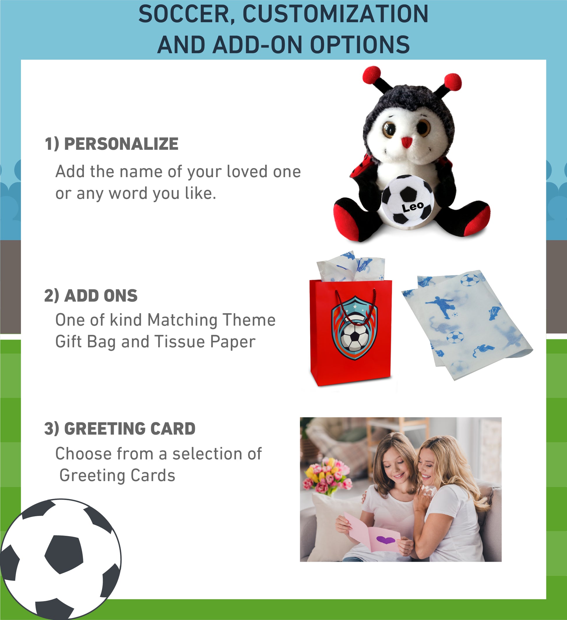 PERSONALIZATION, CUSTOMIZATION, AND ADD-ON OPTIONS - Super Soft Sports Stuffed Animal Sitting Ladybug comes customized with a Soccer Ball Plush. You can personalize it with the name of your loved one imprinted on the item. You also have the option to add some or all of the cool add-ons to make your gift extra special: 1) Gift Bag; 2) Tissue Paper; 3) Greeting Card.