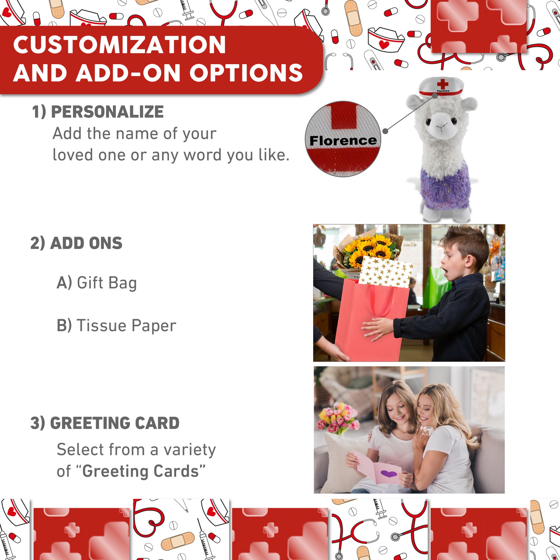 Personalization, Customization, and Add-On Options - The stuffed animal llama comes dressed in a cute nurse cap. Make your nurse teddy bear stuffed animal plush special by adding a personalized name, which we'll imprint onto the llama plush. You can also customize your stuffed animal nurse llama plush by adding any of our add-ons to create the perfect gift: 1) Gift Bag 2) Tissue Paper 3) Greeting Card.