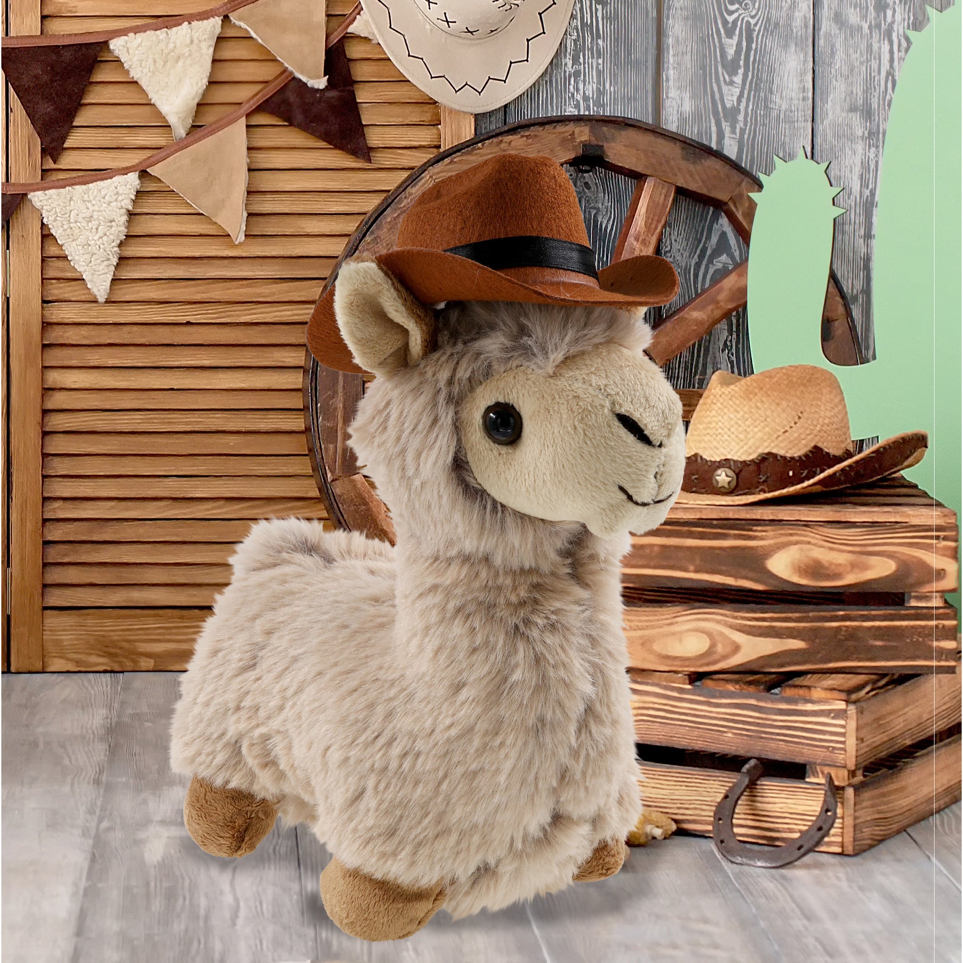 Beige Llama with Western Hat Features Realistic Details from its Cowboy Hat - With its doll cowboy hat, this beige llama figure rocks a look that’s both fun and stylish. The combo of llama toy and cowboy hat accessory creates two playful themes, farm and the Wild West. The plush beige llama with cowboy bear outfit hat makes the perfect addition to your collection of plush toys and cool stuffed animal clothing.