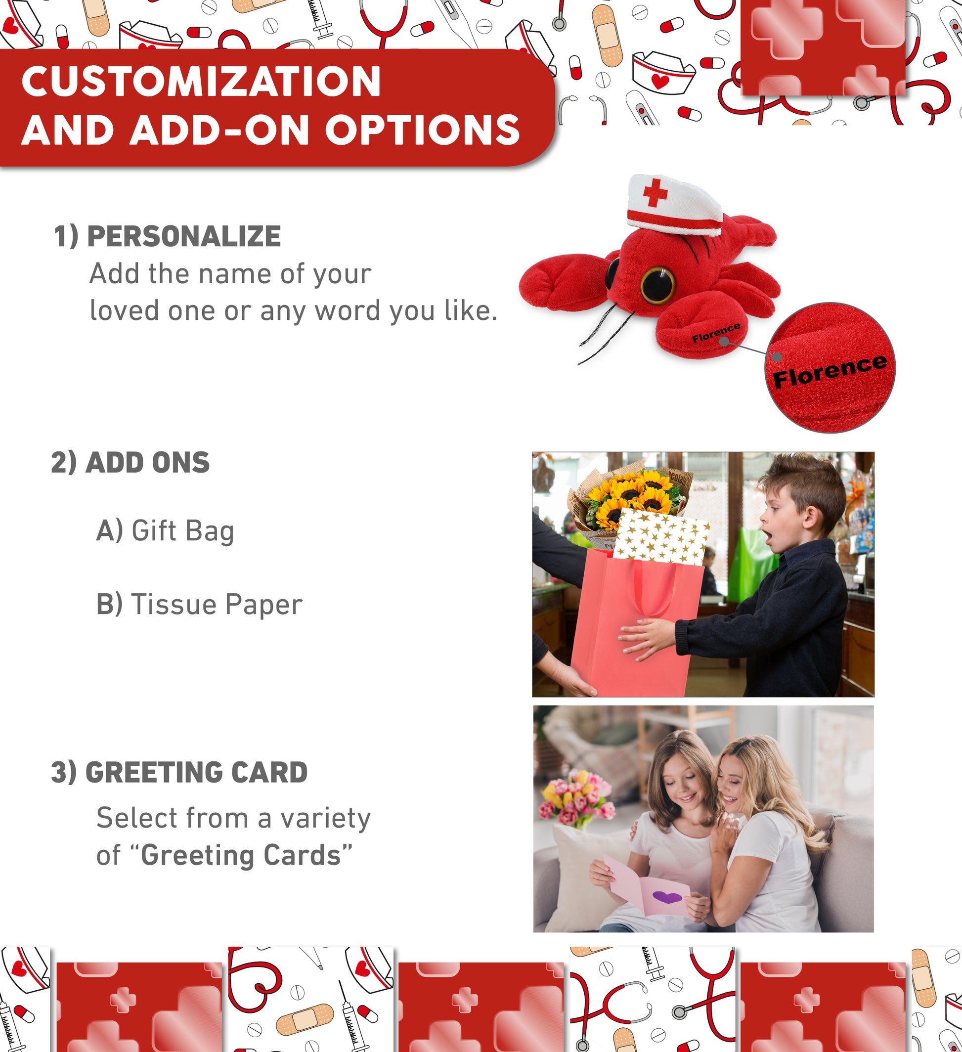 Personalization, Customization, and Add-On Options - The stuffed animal lobster comes dressed in a cute nurse cap. Make your nurse teddy bear stuffed animal plush special by adding a personalized name, which we'll imprint onto the lobster plush. You can also customize your stuffed animal nurse lobster plush by adding any of our add-ons to create the perfect gift: 1) Gift Bag 2) Tissue Paper 3) Greeting Card.
