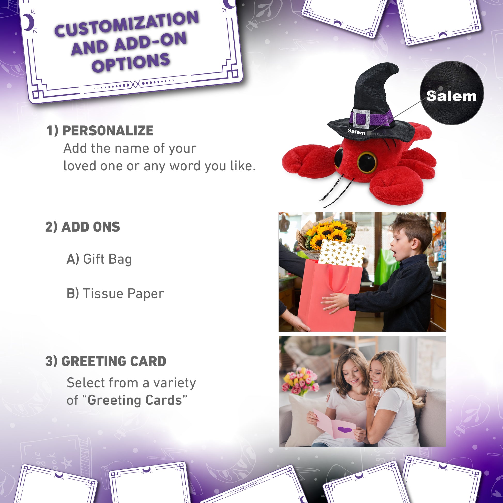 Personalization, Customization, and Add-On Options - The lobster Halloween plush toy comes dressed in a witch outfit, complete with a pointy black witch hat. Make your teddy bear doll special by adding a personalized name, which we will imprint onto the plush. You can also customize your witch lobster stuffed animal by adding any of our add-ons to create the perfect gift: 1) Gift Bag 2) Tissue Paper 3) Greeting Card.