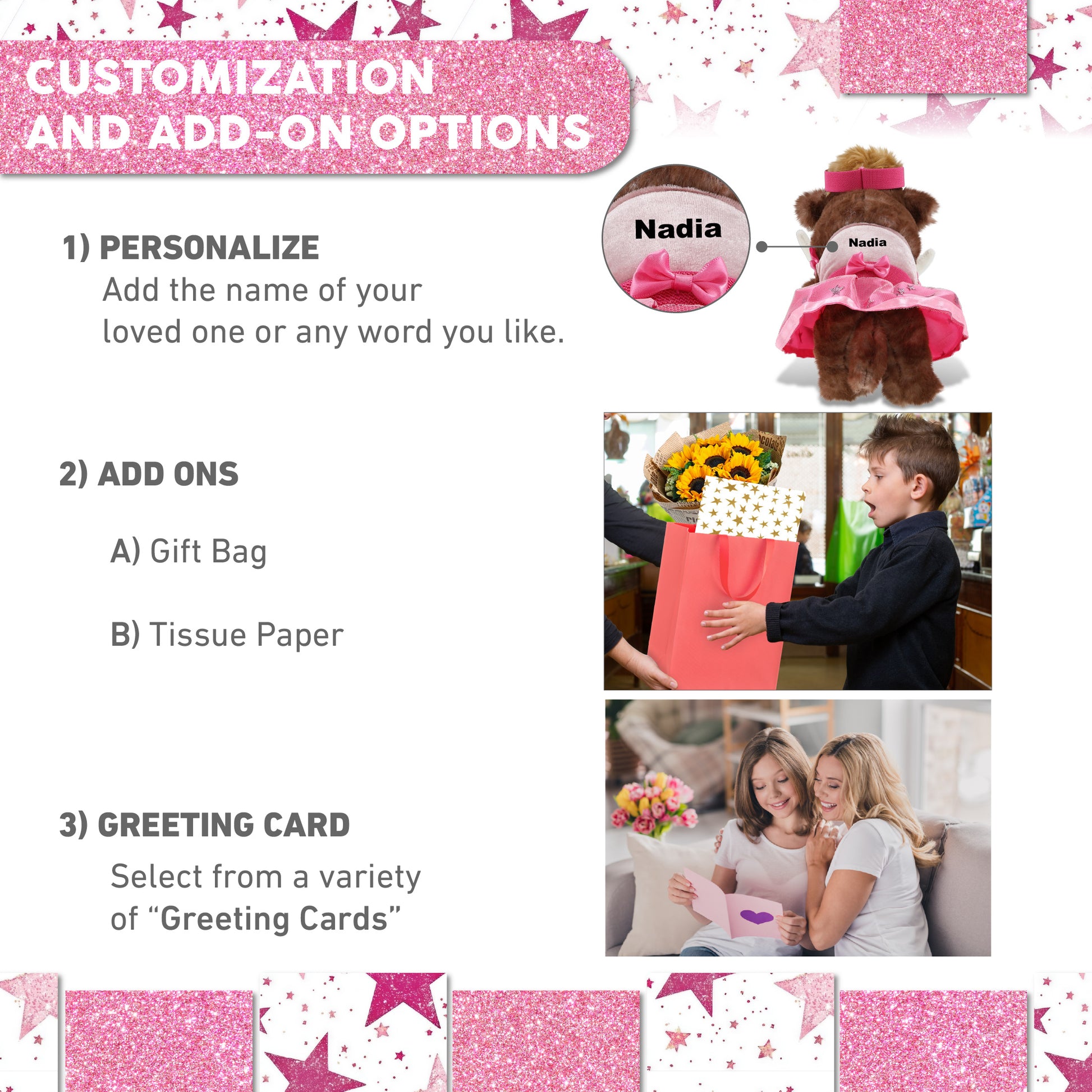 Personalization, Customization, and Add-On Options - The mammoth plush toy comes dressed in a charming pink ballerina outfit, complete with tutu skirt, headband, and shirt. Make it meaningful by personalizing it with the name, which we will imprint directly onto the plush. You can also customize your ballerina mammoth stuffed animal doll by adding any of our add-ons to create the perfect gift: 1) Gift Bag 2) Tissue Paper 3) Greeting Card.