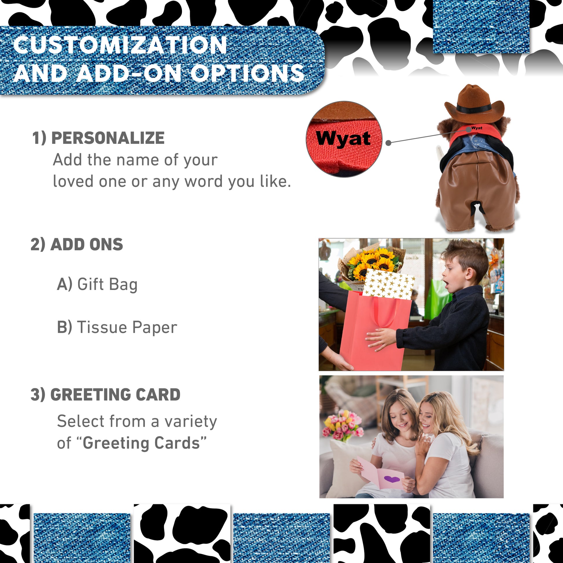 Personalization, Customization and Add-On Options - The mammoth stuffed animal plush comes dressed in a cowboy outfit, complete with cowboy vest shirt, pants, bandana, and cowboy hat. Make it cool by personalizing it with the name, which we will imprint directly onto the stuffy plush. You can also customize your cowboy plush mammoth by adding any of our add-ons to create the perfect gift: 1) Gift Bag 2) Tissue Paper 3) Greeting Card.