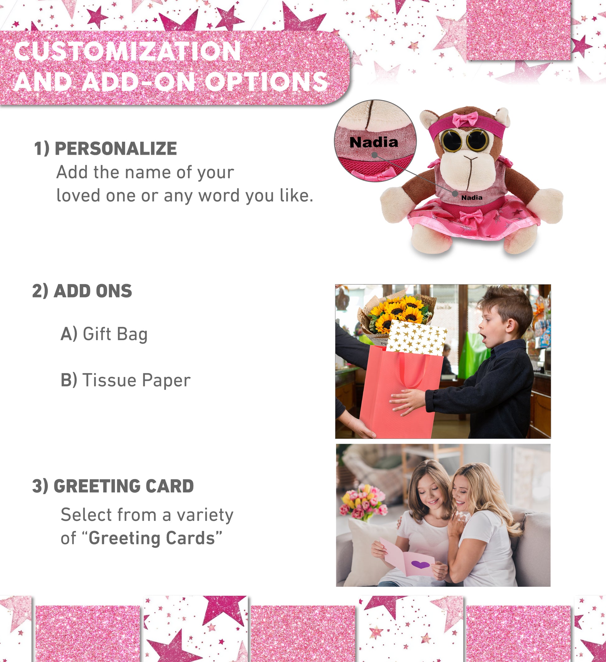 Personalization, Customization, and Add-On Options - The monkey plush toy comes dressed in a charming pink ballerina outfit, complete with tutu skirt, headband, and shirt. Make it meaningful by personalizing it with the name, which we will imprint directly onto the plush. You can also customize your ballerina monkey stuffed animal doll by adding any of our add-ons to create the perfect gift: 1) Gift Bag 2) Tissue Paper 3) Greeting Card.
