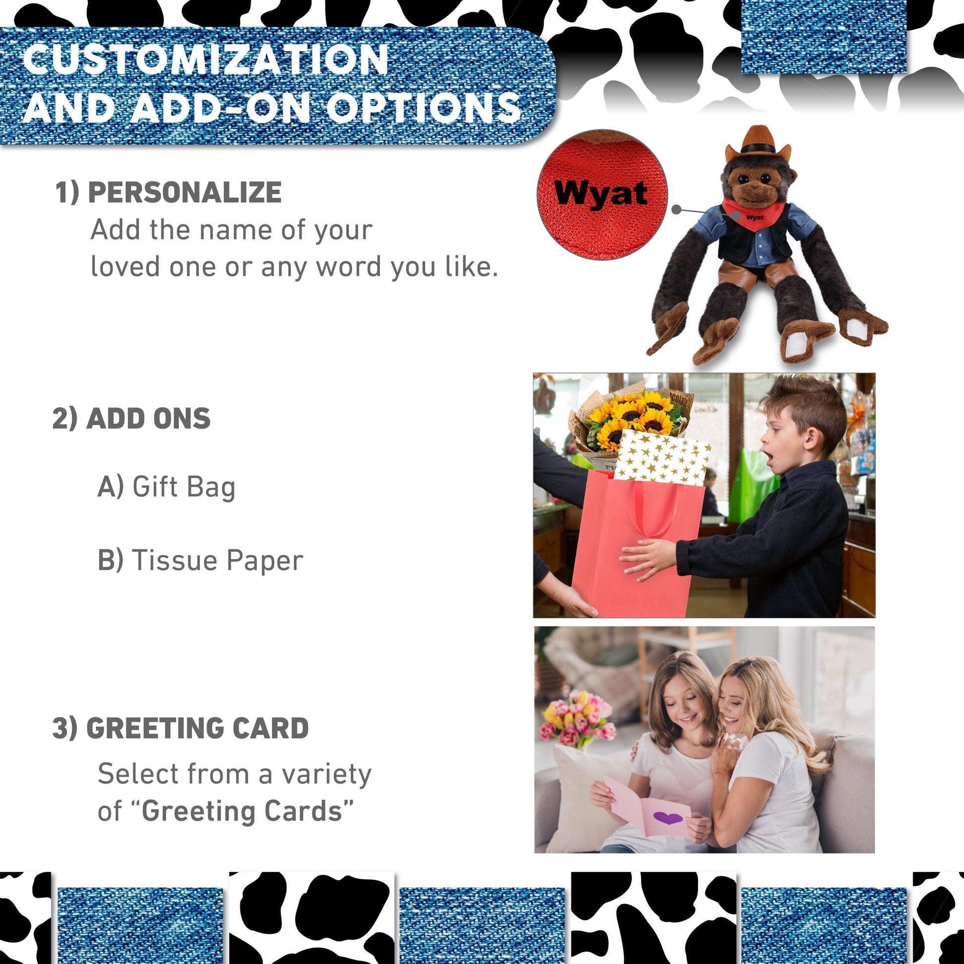 Personalization, Customization and Add-On Options - The black capuchin monkey stuffed animal plush comes dressed in a cowboy outfit, complete with cowboy vest shirt, pants, bandana, and cowboy hat. Make it cool by personalizing it with the name, which we will imprint directly onto the stuffy plush. You can also customize your cowboy plush monkey by adding any of our add-ons to create the perfect gift: 1) Gift Bag 2) Tissue Paper 3) Greeting Card.