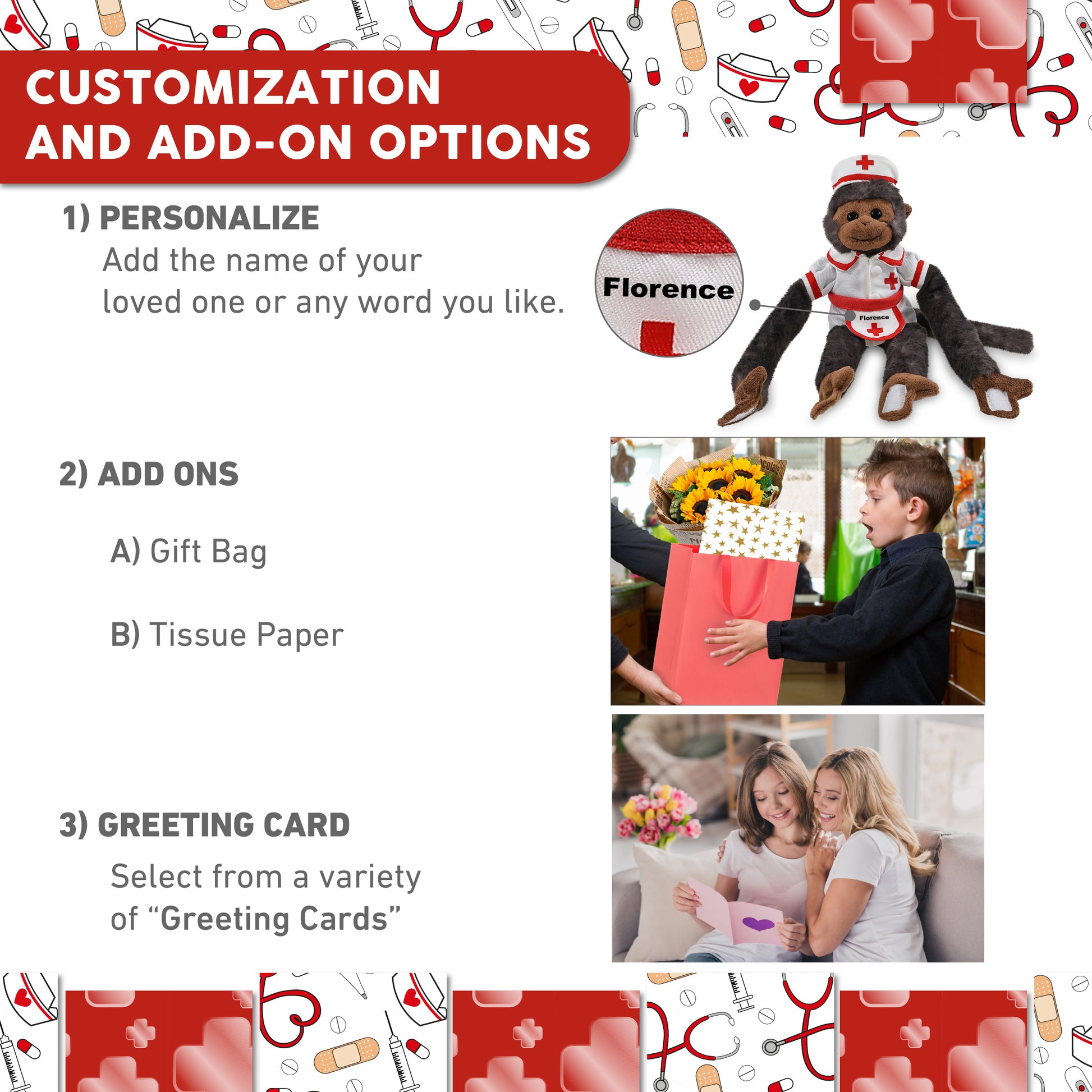 Personalization, Customization, and Add-On Options - The stuffed Capuchin Monkey comes dressed in a cute nurse costume, complete with nurse cap, nurse dress and apron. Make your nurse teddy bear stuffed animal plush special by adding a personalized name, which we'll imprint onto the plush. You can also customize your nurse monkey plush by adding any of our add-ons to create the perfect gift: 1) Gift Bag 2) Tissue Paper 3) Greeting Card.