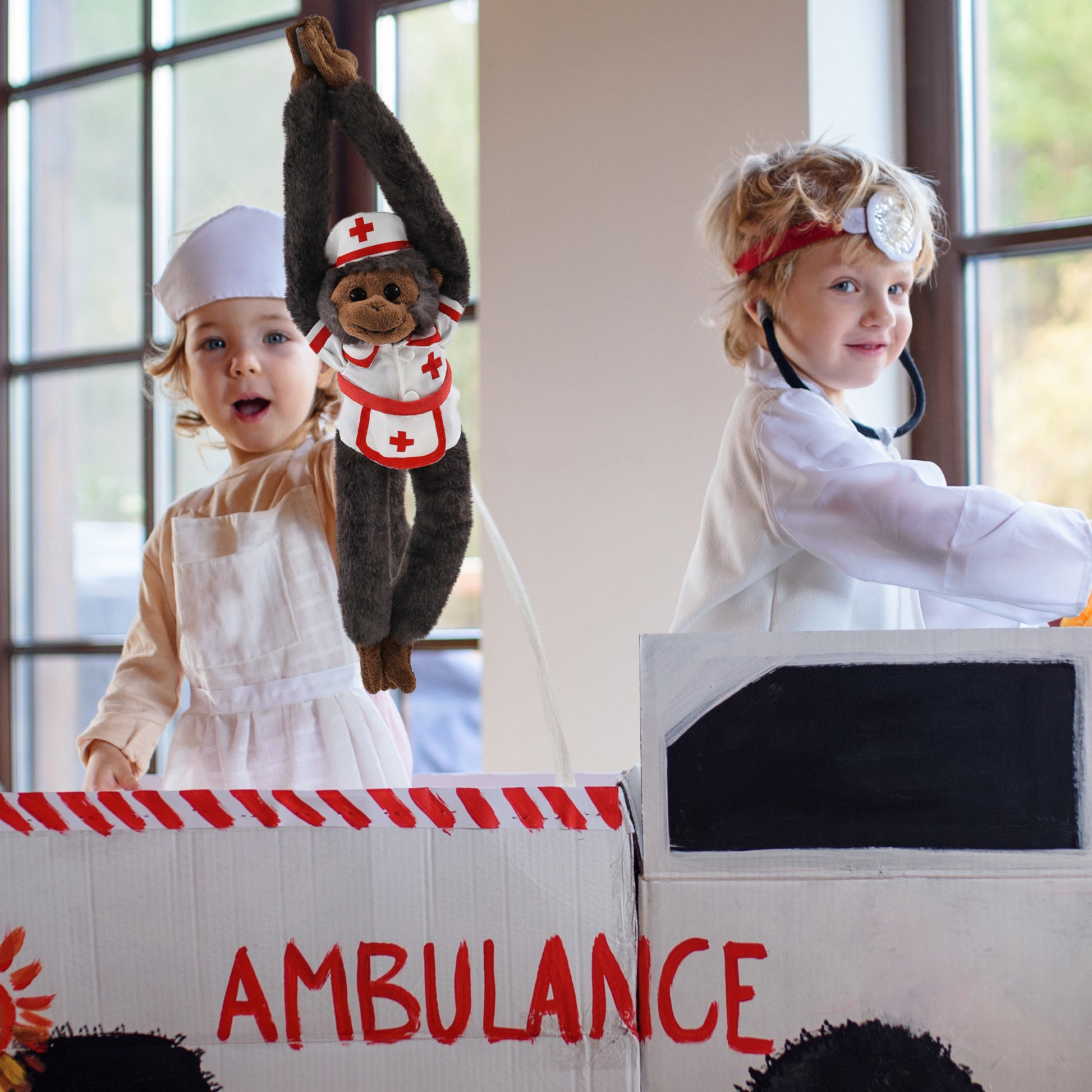 Includes 1 DolliBu Long Arms Black Capuchin Monkey Plush with Nurse Outfit - It comes with a cuddly monkey plush dressed in a nurse outfit, complete with a nurse cap with red cross, white collared nurse dress, and apron. This monkey toy with nurse teddy bear white nurse dress is perfect for role-playing or plush gifts for someone who is sick for them to feel cared for. It measures 21Lx3.5Wx6.5H inches. This plush is ideal for kids ages 3 and up.