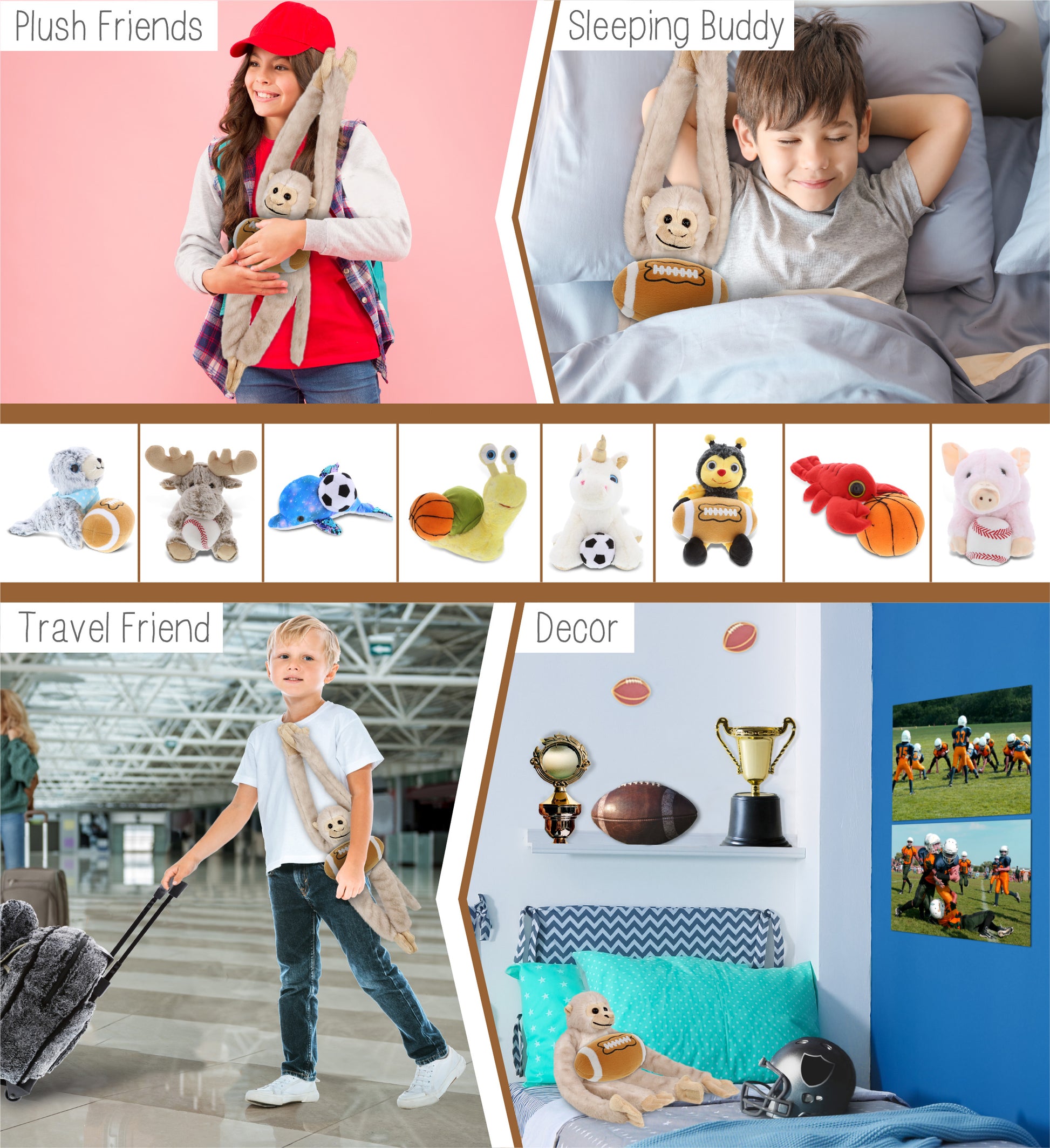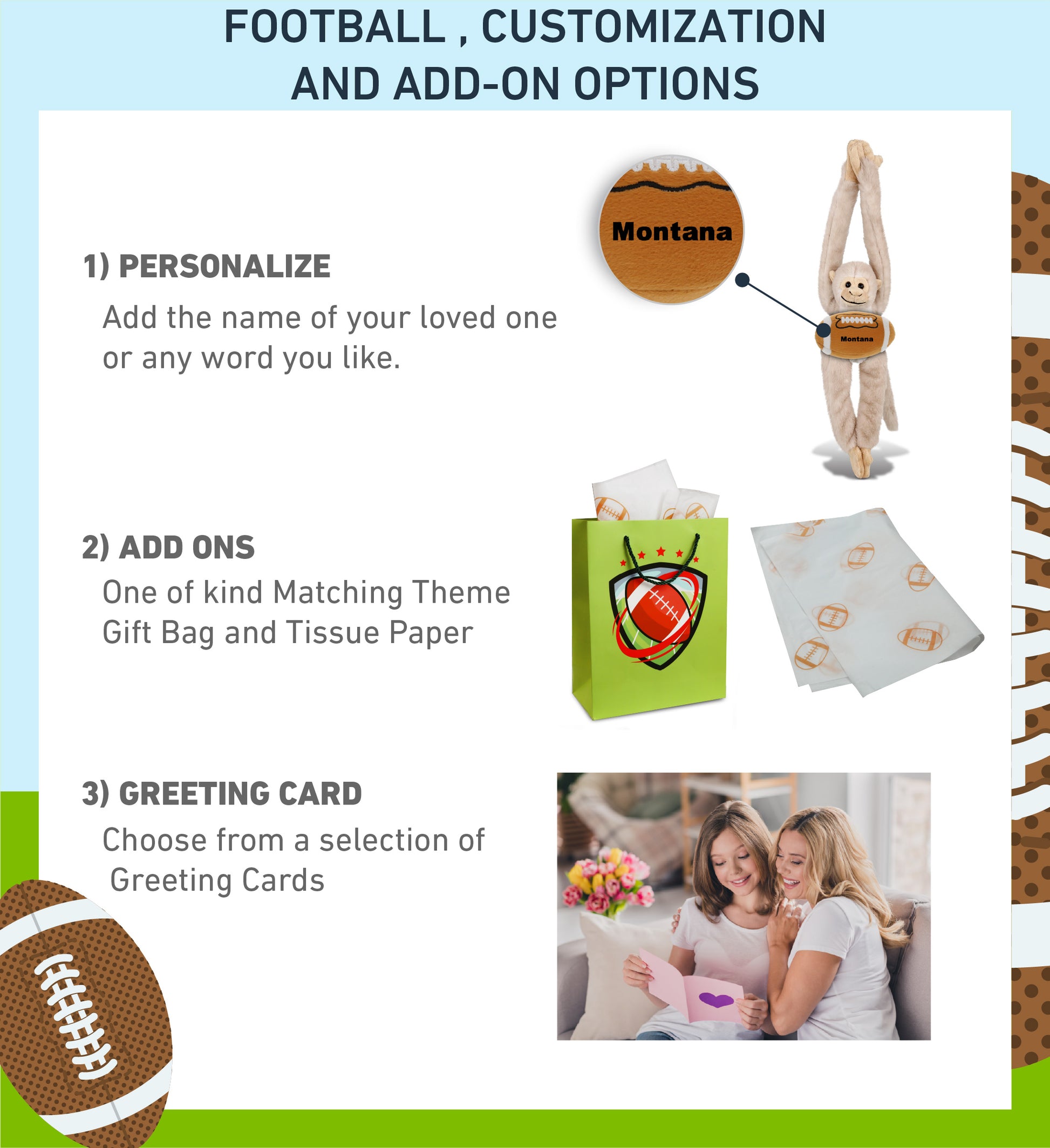 PERSONALIZATION, CUSTOMIZATION, AND ADD-ON OPTIONS - Super Soft Sports Stuffed Animal Long Arm Hanging White Squirrel Monkey comes customized with a Football Plush. You can personalize it with the name of your loved one imprinted on the item. You also have the option to add some or all of the cool add-ons to make your gift extra special: 1) Gift Bag; 2) Tissue Paper; 3) Greeting Card.