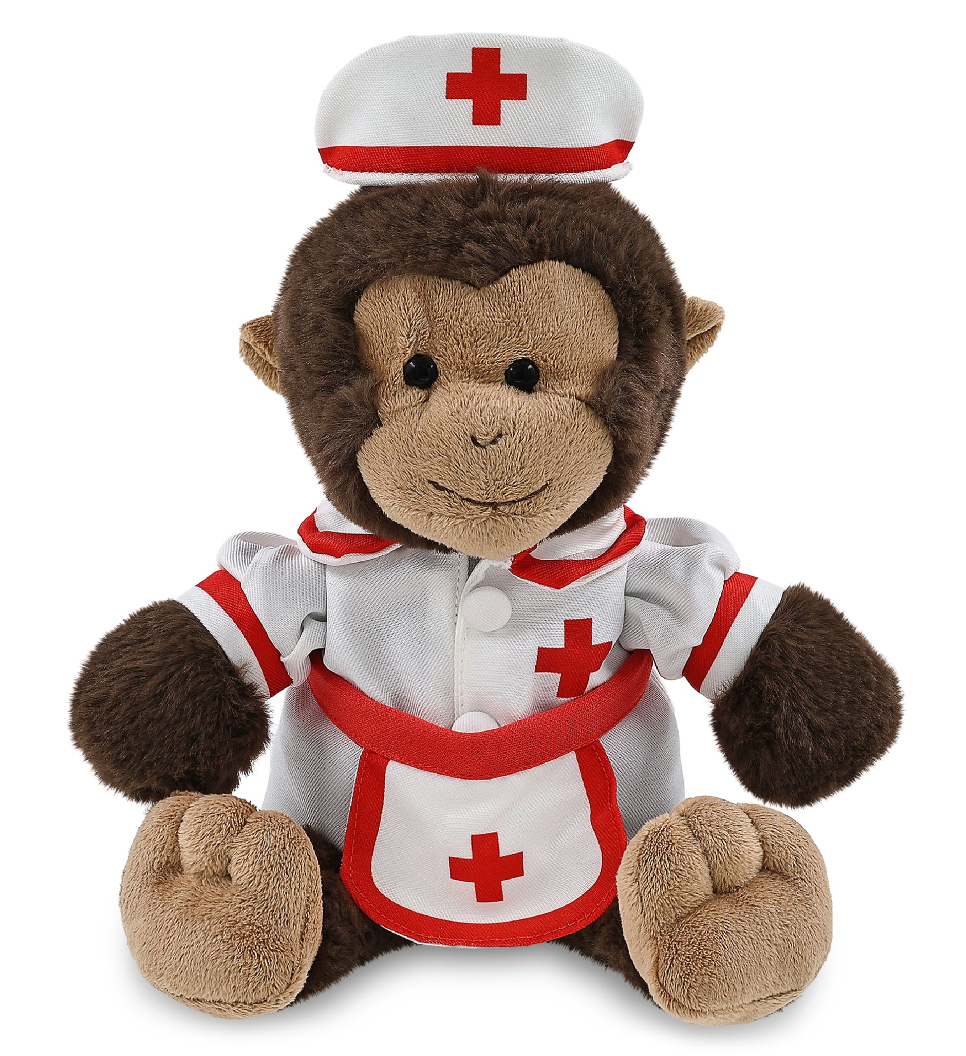 Monkey with Nurse Stuffed Animal Clothes Features a Classic Nurse Outfit - Designed with red lining and a cross against the white nurse dress and the nurse cap and apron. The monkey stuffed animal plush has soft plush, perfect for everyday snuggles. This stuffed animal with clothes makes the perfect addition to your collection of monkey teddy bear with clothes or giveaway hospital toys to give to sick children.