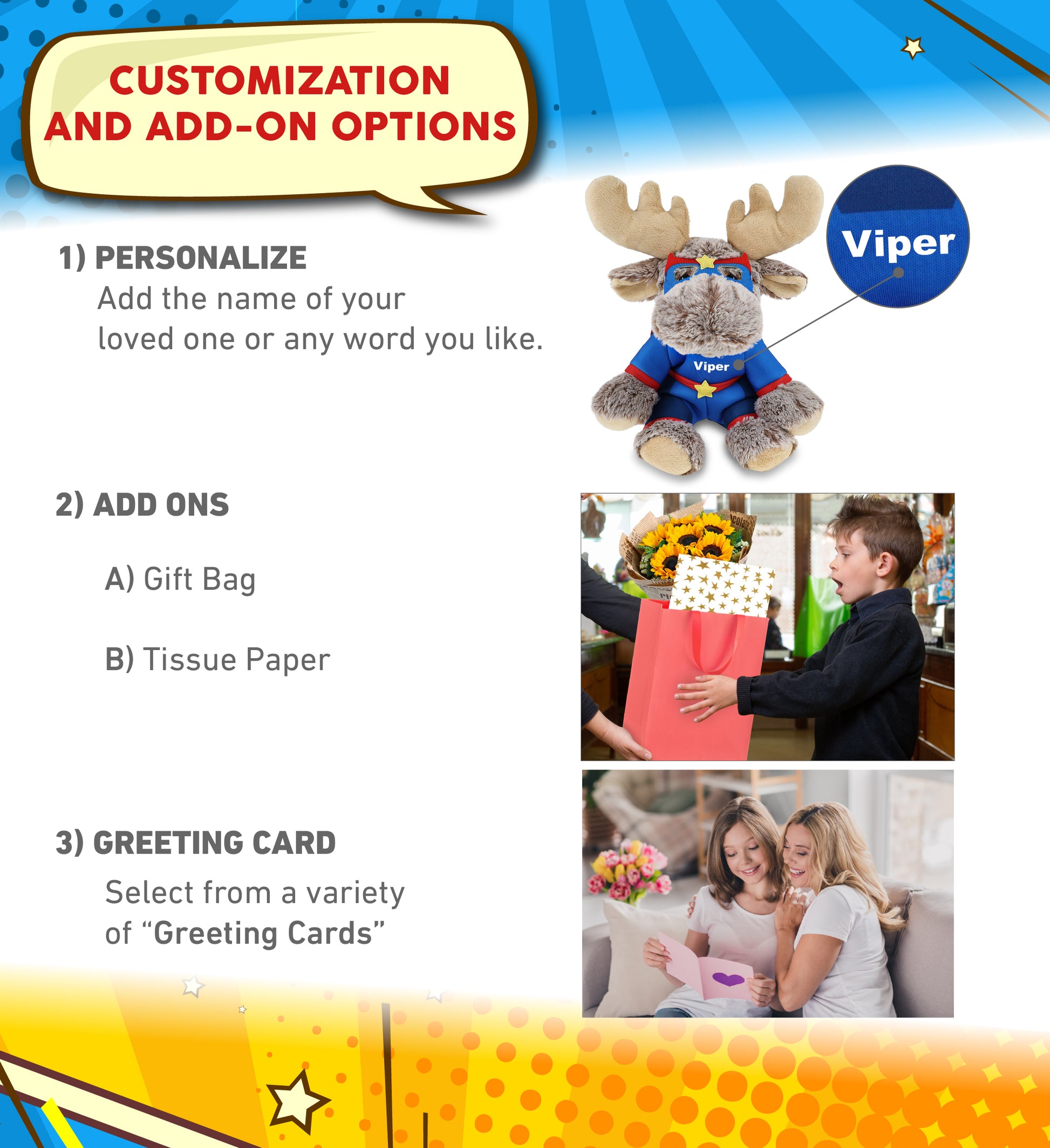 Personalization, Customization, and Add-On Options - The floppy moose stuffed animal comes dressed in a full superhero outfit, complete with eye mask, suit with cape, and star details. Make your super hero moose toy special by adding a personalized name, which we will imprint onto the plush. You can also customize your plush hero toy by adding any of our add-ons to create the perfect gift: 1) Gift Bag 2) Tissue Paper 3) Greeting Card.