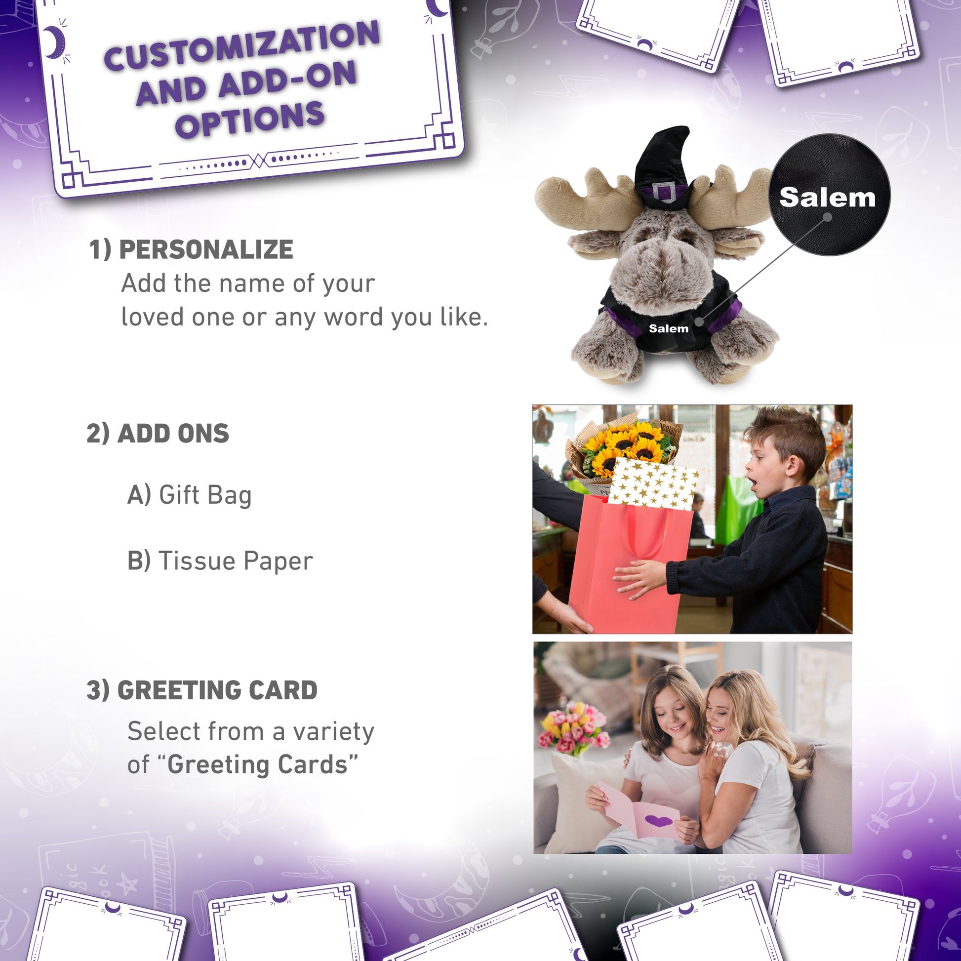 Personalization, Customization, and Add-On Options - The moose Halloween plush toy comes dressed in a witch outfit, complete with black and purple cloak and pointy black witch hat. Make your teddy bear doll special by adding a personalized name, which we will imprint onto the plush. You can also customize your witch moose stuffed animal by adding any of our add-ons to create the perfect gift: 1) Gift Bag 2) Tissue Paper 3) Greeting Card.