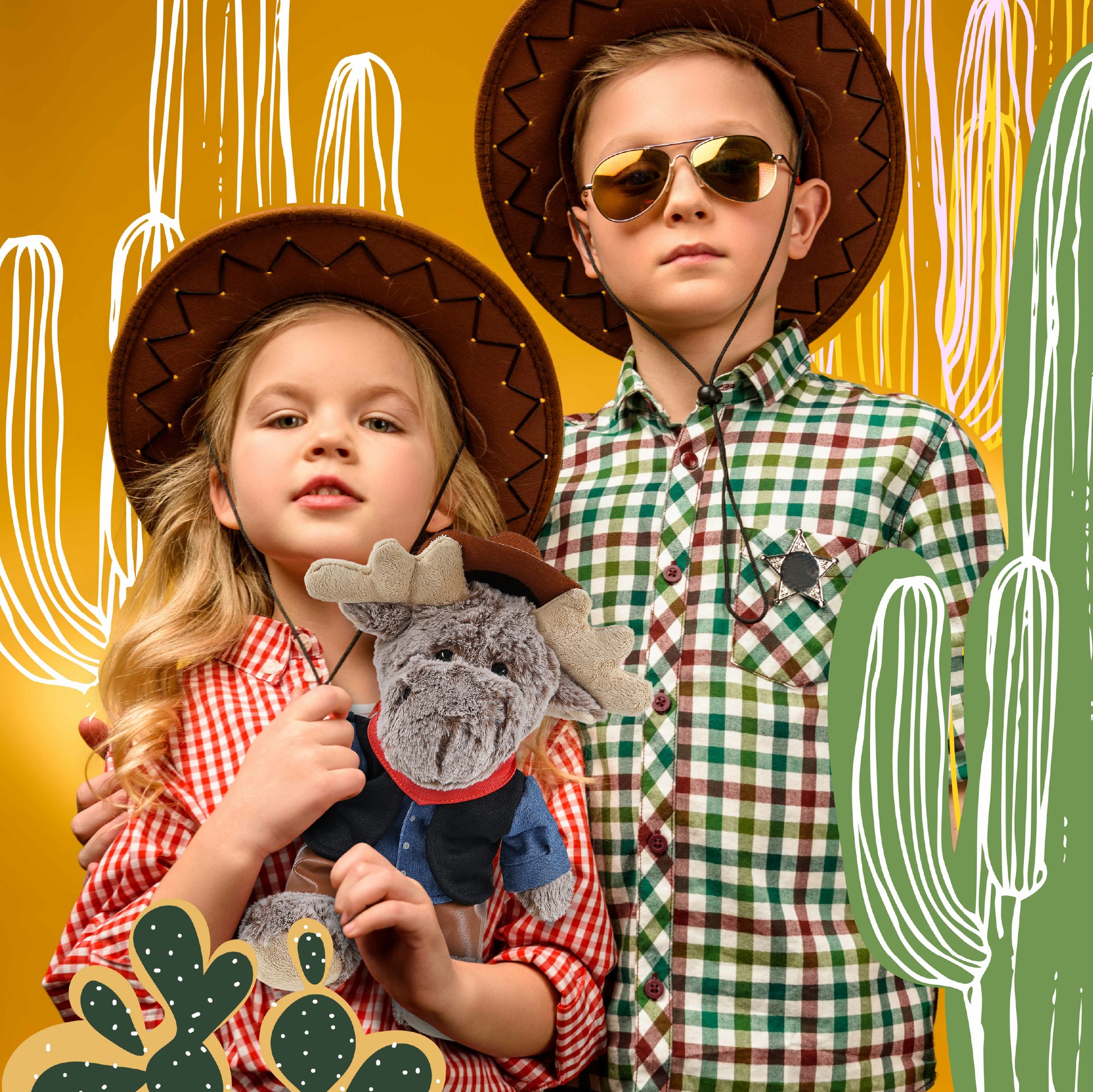 SUPER SOFT PLUSH - SITTING MOOSE WITH BROWN HOODED SWEATER COWBOY DRESS UP