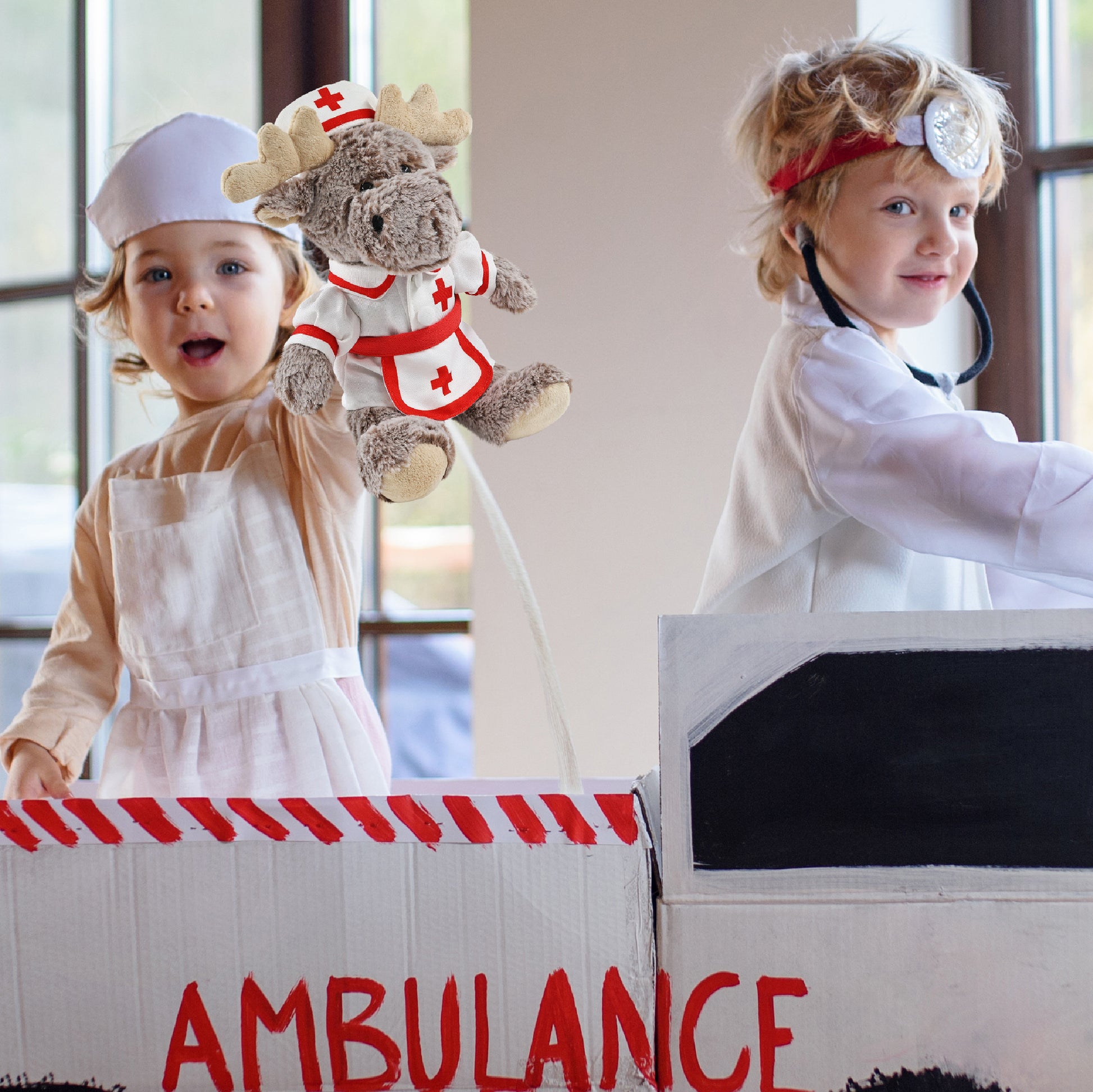 SUPER SOFT PLUSH - SITTING MOOSE WITH BROWN HOODED SWEATER NURSE