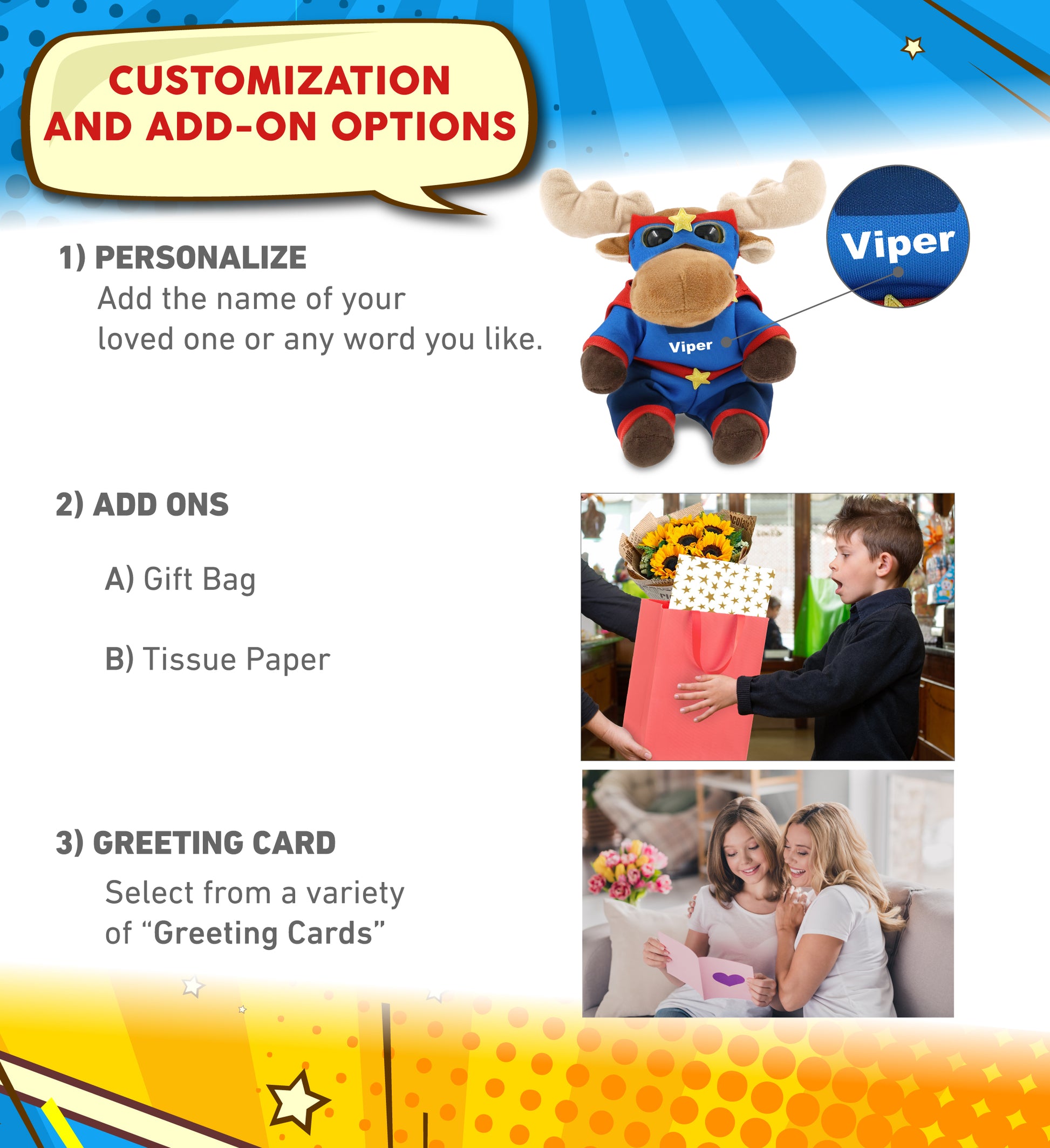 Personalization, Customization, and Add-On Options - The Big Eye Moose stuffed animal comes dressed in a full superhero outfit, complete with eye mask, suit with cape, and star details. Make your super hero moose toy special by adding a personalized name, which we will imprint onto the plush. You can also customize your plush hero toy by adding any of our add-ons to create the perfect gift: 1) Gift Bag 2) Tissue Paper 3) Greeting Card.