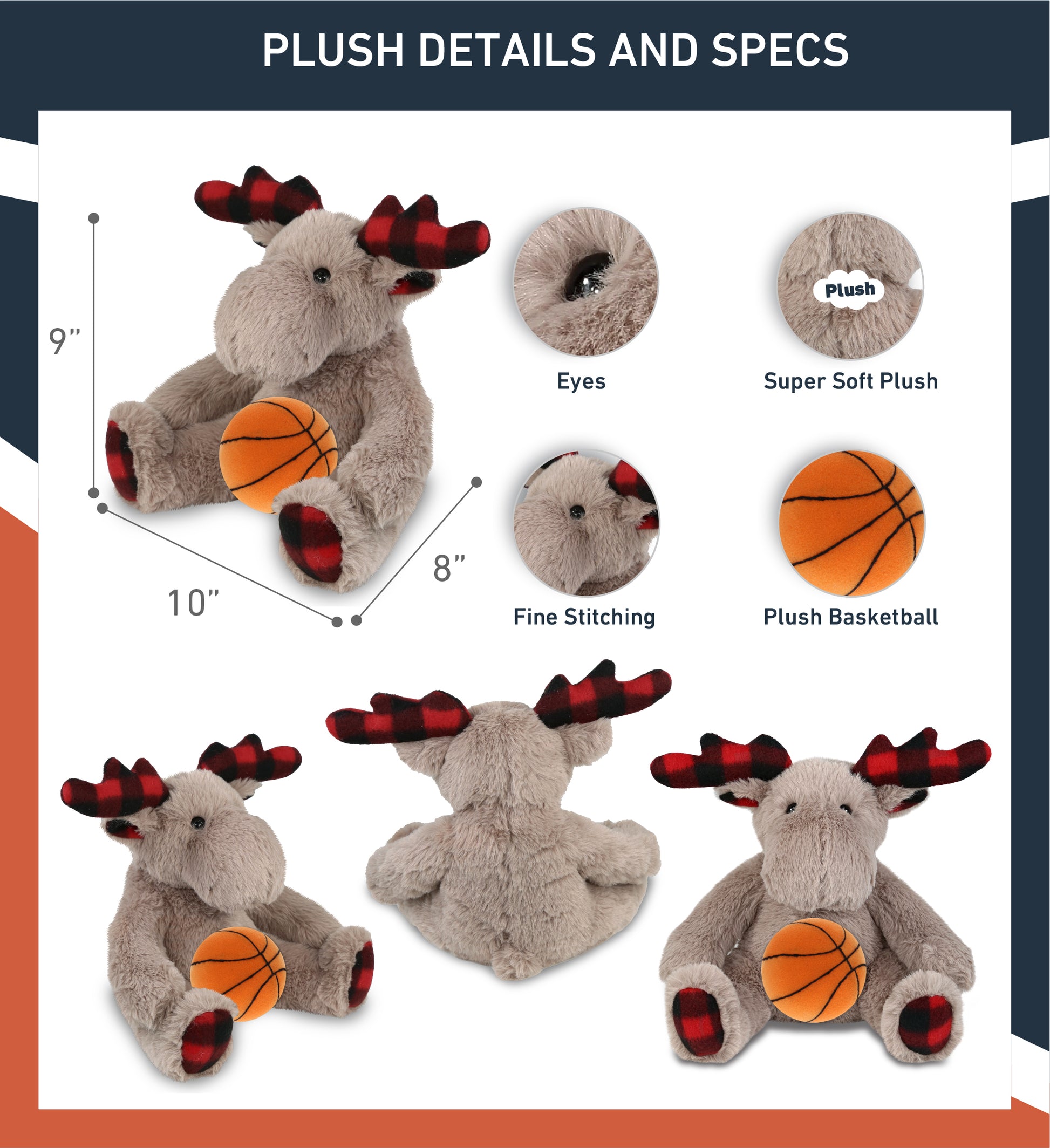 DolliBu Plaid Beige Moose Stuffed Animal with Basketball Plush - Soft Huggable Moose, Fun Playtime Plush Toy, Cute Wildlife Gift, Personalized Doll Animal Toy for Kids and Adults - 10 Inches